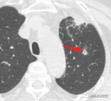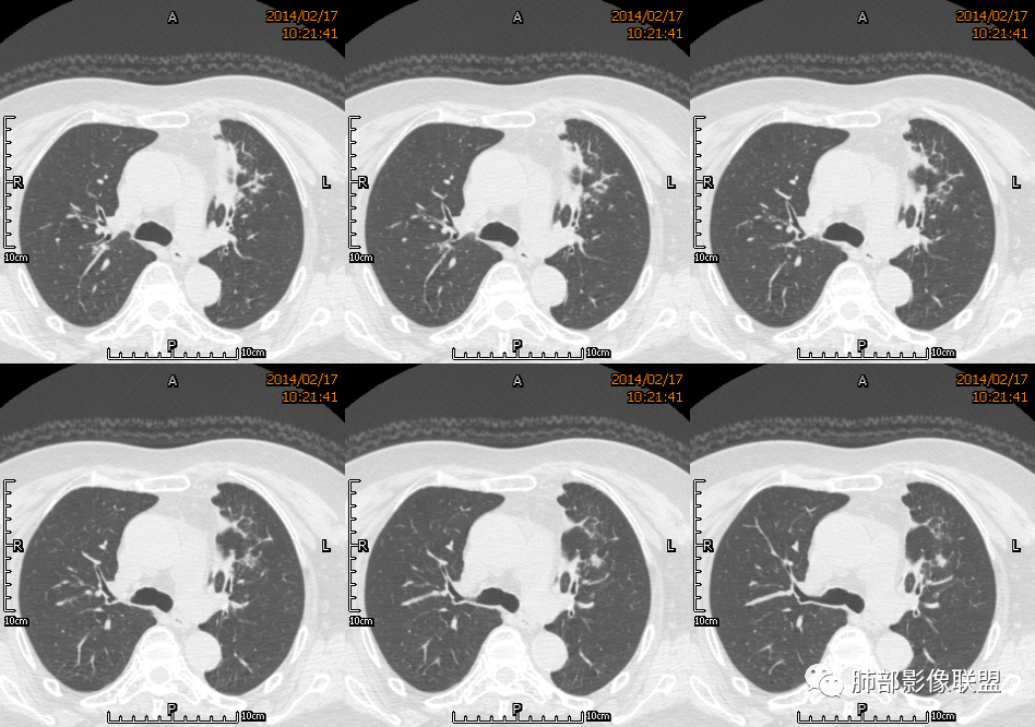 王崇军: 老年女性,咳嗽咳痰10天,痰中带血4天。左肺上叶前段胸膜下 肿块影及段形态密度增高影,沿支气管方向走行,膨胀生长为主,局部有收缩改变,支气管进入并闭塞,中间有小片状的坏死及小的空洞影,空洞漂浮在坏死边缘,增强扫描病灶明显的强化,坏死边界清楚,似乎有轻度强化环,病灶周围网格状的小叶间隔增厚及小结节影,外侧胸膜呈糊墙改变。考虑为肺脓肿,这么大的病灶,竟然没有发烧,白细胞低,CPR轻度升高,均与脓肿不符,所以恶性待排,短期抗炎治疗后复查,病灶没有变化,脓肿就可以排除,恶性基本可以确定。