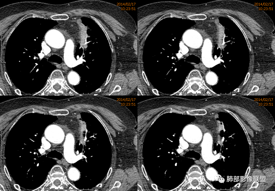 秦化君: 左肺上叶前段胸膜下软组织密度肿块影,边缘清晰,部分边缘膨隆,纵隔缘弧形内凹,脂肪界面清晰。肿块中心密度减低,支气管进入病灶后截断,似有扩张表现,病灶周围可见小叶间隔增厚,斑片影,近端支气管似管壁增厚。增强后明显强化,中心见低密度区。考虑:1.肉芽肿性炎?2.IMT?3.淋巴瘤?