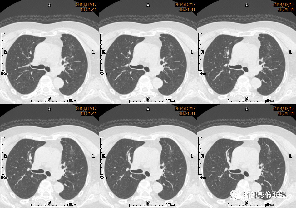 红星: 老年女性,咳嗽咳痰10天,痰中带血4天。左肺上叶前段胸膜下肿块影,沿支气管方向走行以膨胀生长为主,局部有收缩改变,支气管血管绝断,中间有小片状的坏死及小的空洞影,增强扫描病灶明显的强化,病灶周围网格状的小叶间隔增厚。拟左肺上叶前段浸润型腺癌并癌性淋巴管炎。鉴别诊断结核肉芽肿。