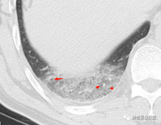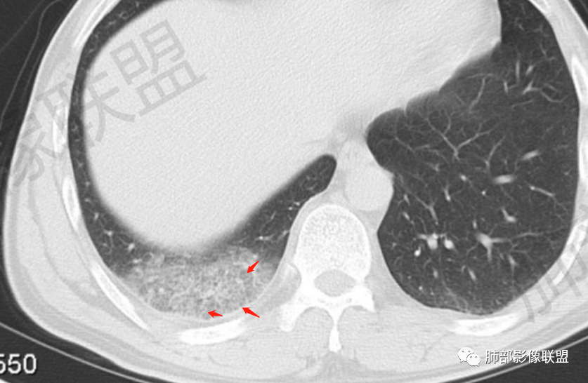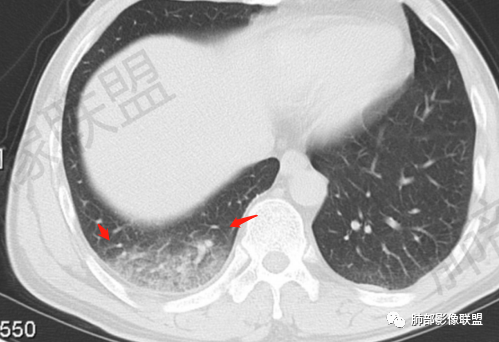 丽:中年男性,胸闷,无咳嗽,右肺散在片状、索条及结节影,部分见反晕征,上叶为主,考虑结核。右肺下叶胸膜下磨玻璃密度,可见网格,考虑肺栓塞