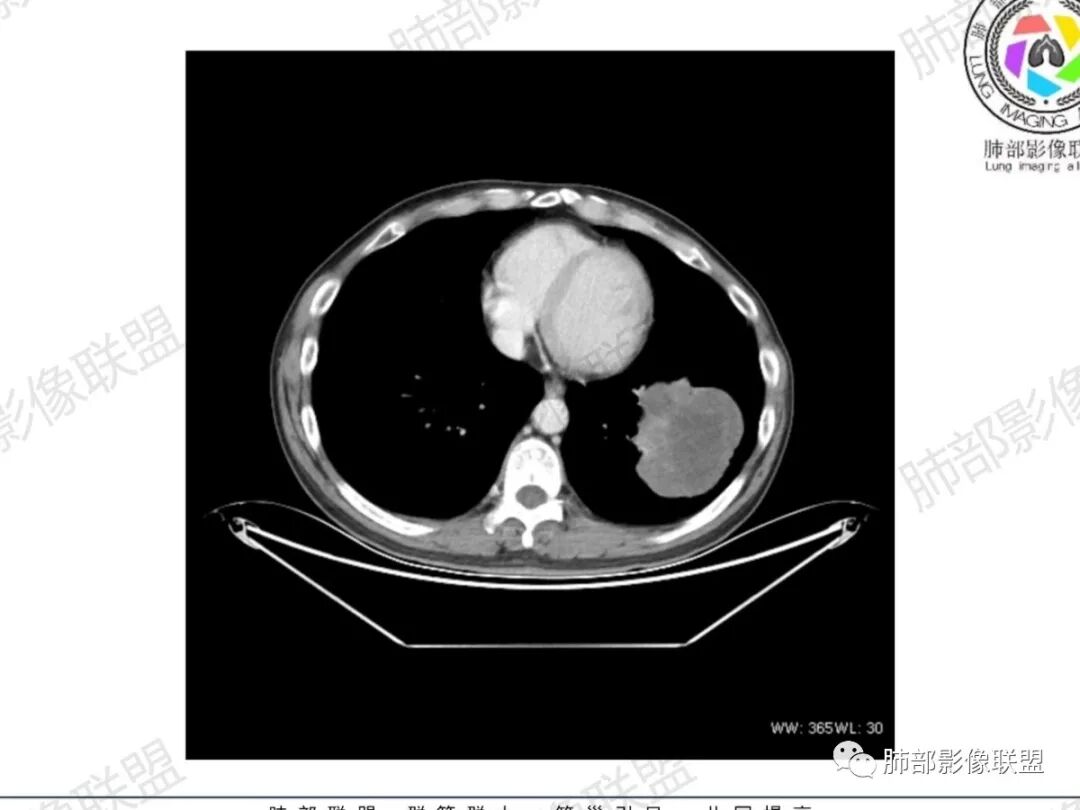 2.左肺外围胸膜下,肿块体积较大,边缘光滑,浅分叶。病灶周围比较干净(未见肺不张或阻塞性炎症)。未见毛刺及血管集束征。