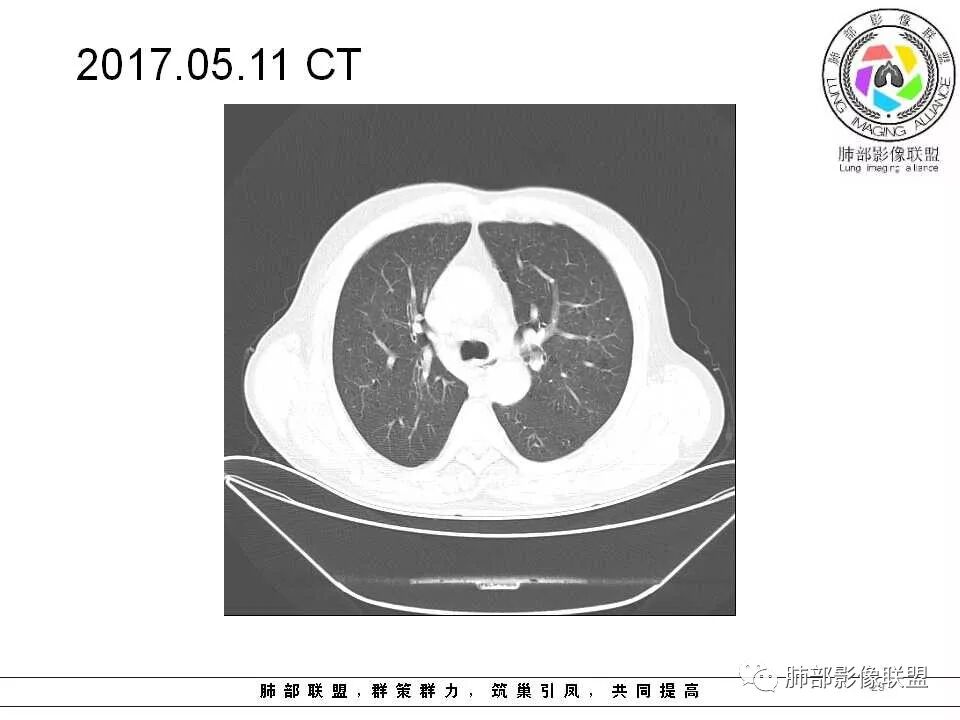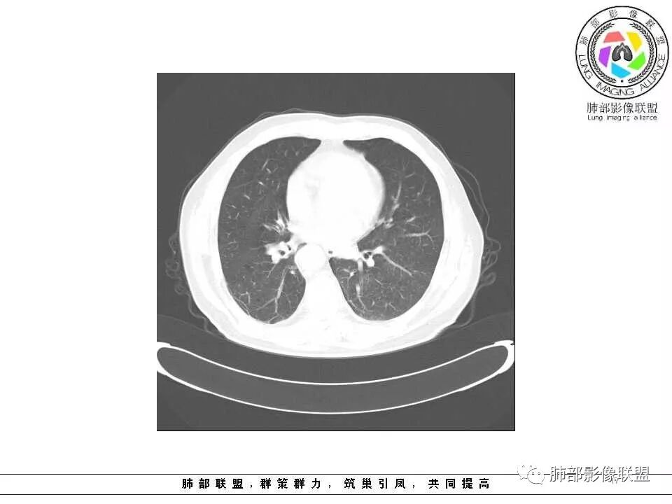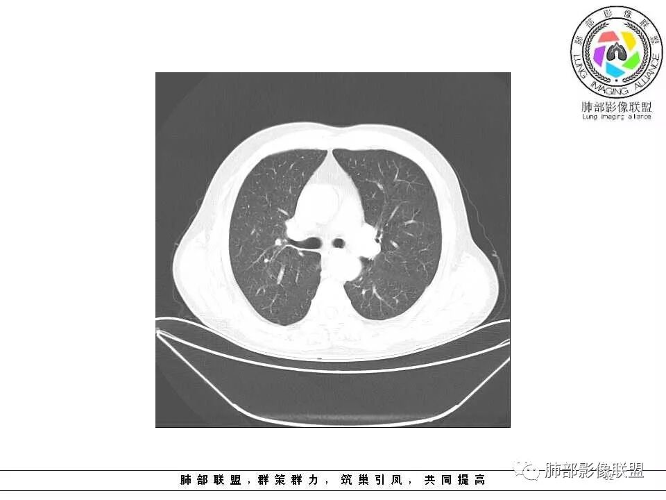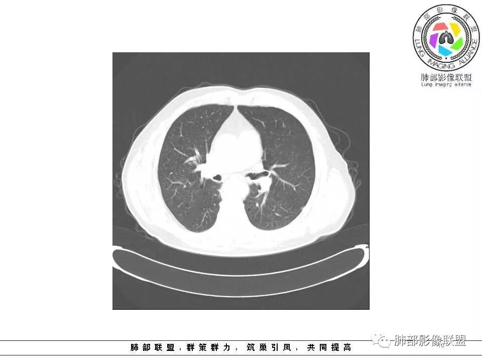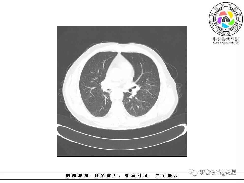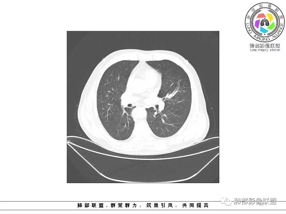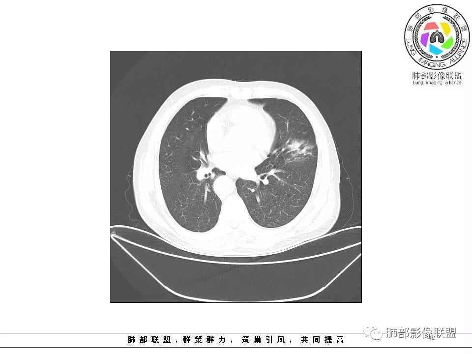 左肺舌段条片状实变影,边界较清楚,形态不规则,平行于支气管,其内可见支气管扩张,考虑炎性病变(OP,结核,NTM)鉴别:淋巴瘤
