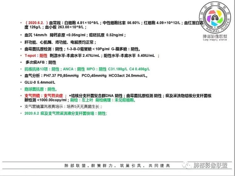 左肺散在多发斑片状影,下叶为著,左肺下叶较大团片影边缘模糊有磨玻璃影,有空泡,血管进入,气管分支似有闭塞,胸膜牵拉,抗炎治疗效果差,Tspot阳性,余隐球菌和结核目前实验室检查阴性,家属有肺结核病史,影像不是典型的结核,37岁,先考虑炎性,结核重点排查,粘液痰,需排除粘液腺癌可能,常规治疗后复查。