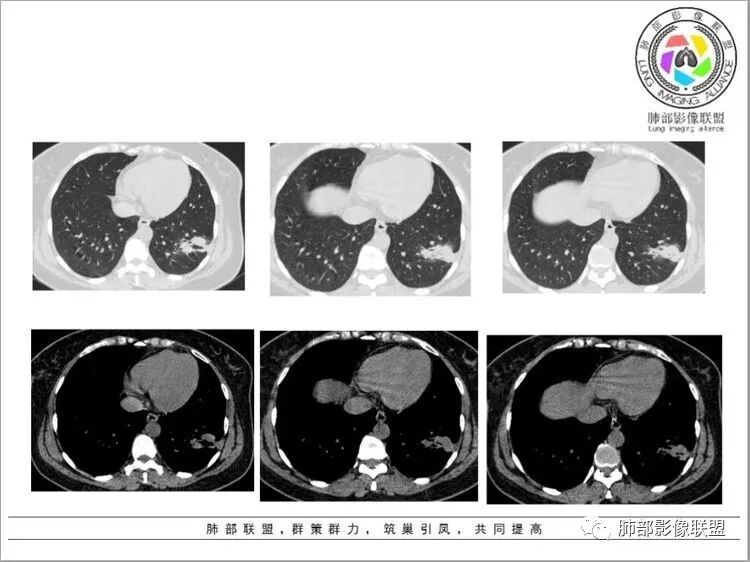 中年女性,咳嗽,白痰,无伴胸痛,无发热,临床实验室检查无特殊。左肺下叶团片影,考虑肉芽肿相关疾病,平扫觉得平行胸膜,周围有晕,未见明显树芽,空洞。考虑隐球菌?鉴别OP样病变。重建看是否平行支气管,如果是,结核也要考虑