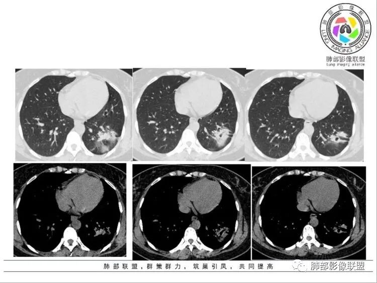 左肺下叶大片实变,周围可见小斑片及磨玻璃影,实变影部分边缘可见晕征,其内可见空泡及支气管扩张,考虑隐球。鉴别结核