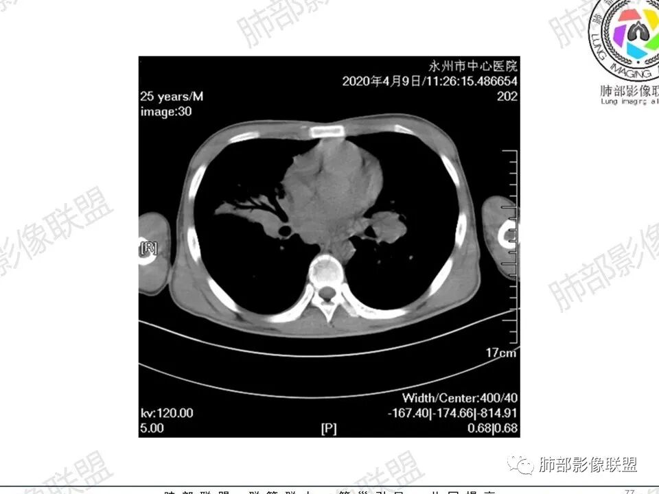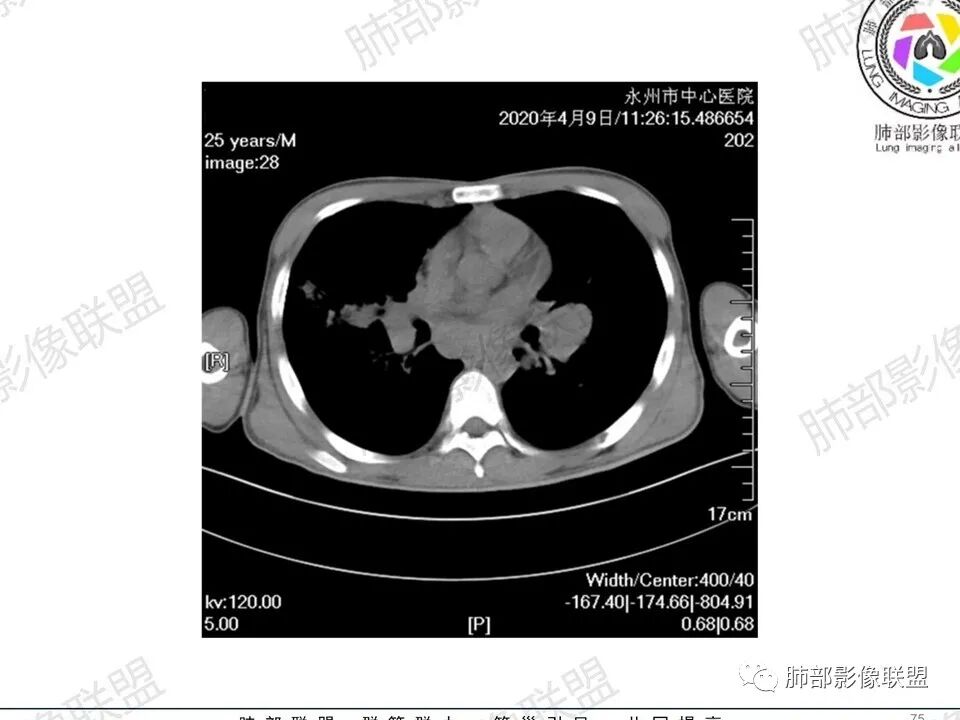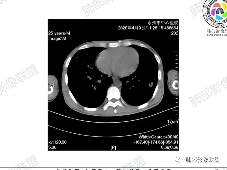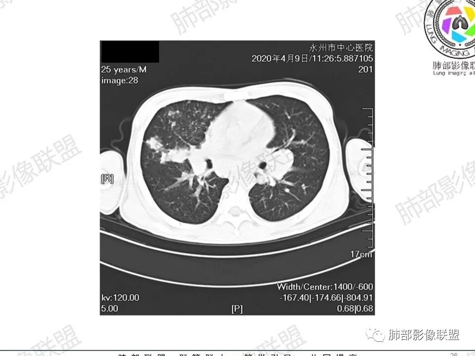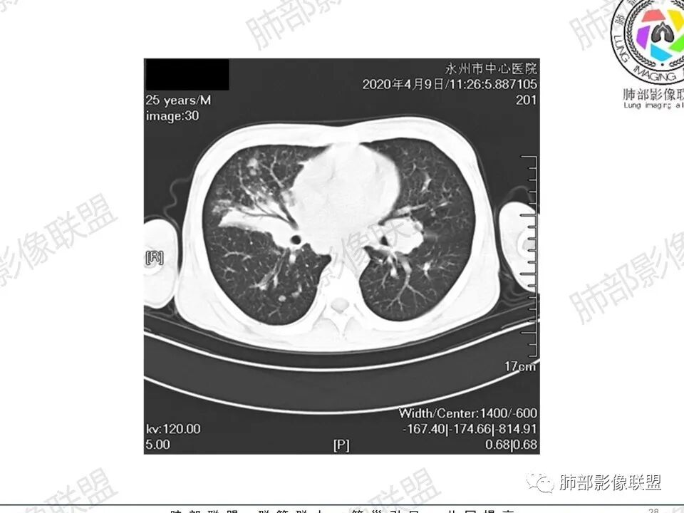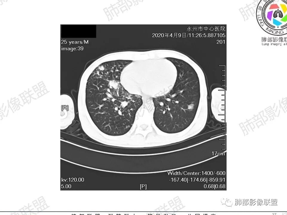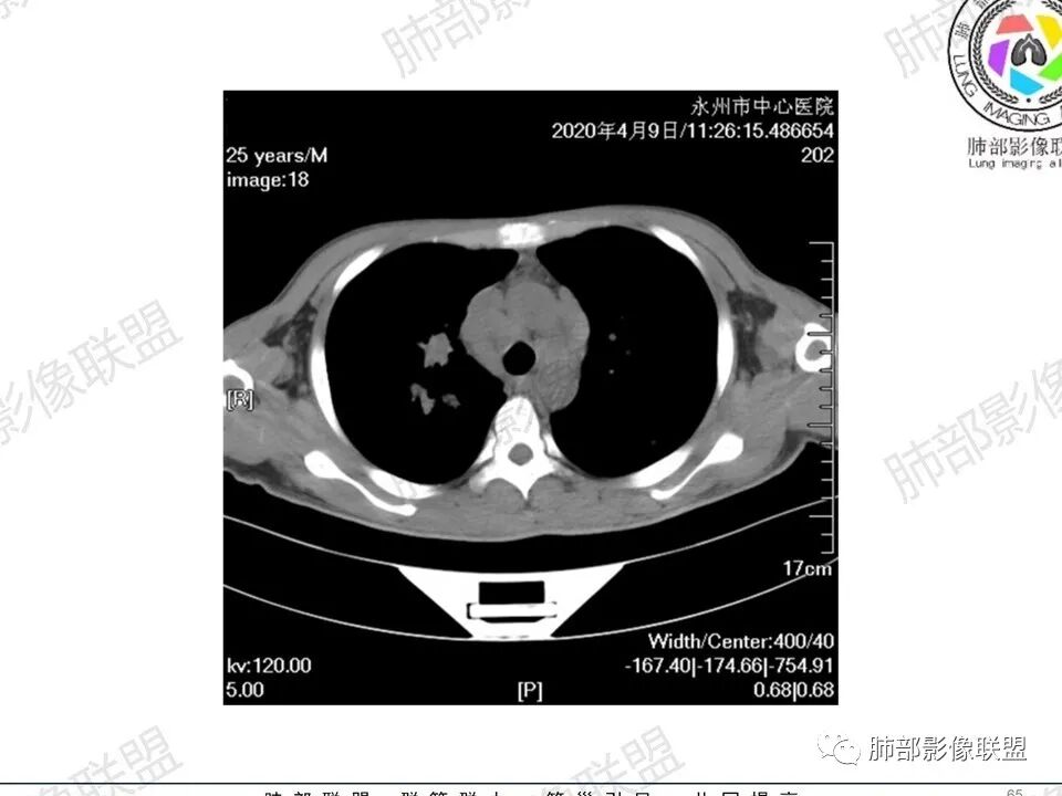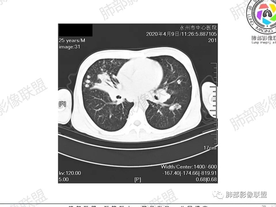 一切∮随缘:双肺多发大小不等结节,结节密度高,边缘清楚,部分结节内可见血管穿行,另右肺长条状实变影,内部可见支气管充气征,局部支气管壁增厚,双肺多发小树丫,双肺门及纵隔淋巴结肿大,部分融合,无增强,对淋巴结坏死无法判断,临床:年轻男性慢性病史急性加重,血象、CRP、ESR高,考虑一元论:结核(年龄加影像都符合),二元论:结节病或淋巴瘤+结核(建议CT增强及淋巴结穿刺),无原发肿瘤病史,癌性淋巴管炎代排。