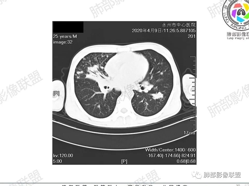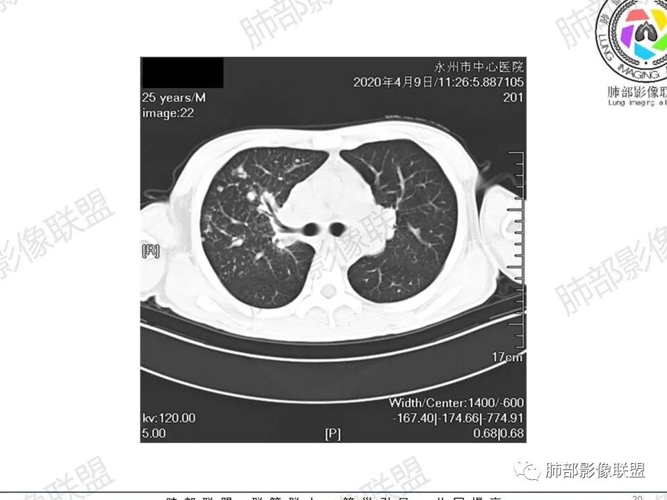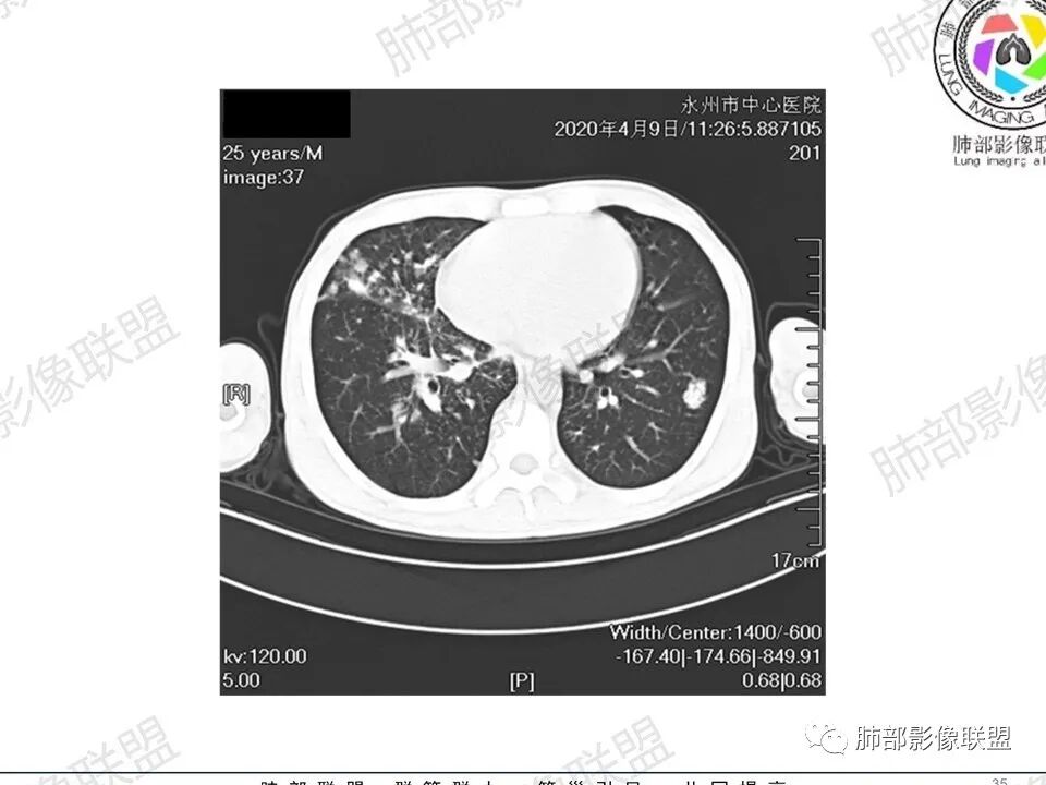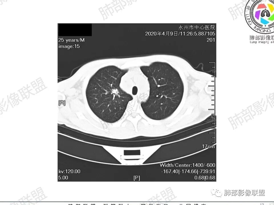 3.双肺多发结节影,没有明显的新旧不等,没有钙化,微小结节影密度偏低,边缘不够僵硬锐利;病灶区域穿行支气管显示良好,未见壁增厚及管腔狭窄,加之病灶如此广泛,病灶未见收缩、肺叶体积未见缩小,结核中毒症状不明显等等都不支持结核。
