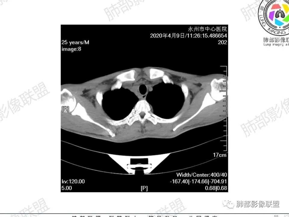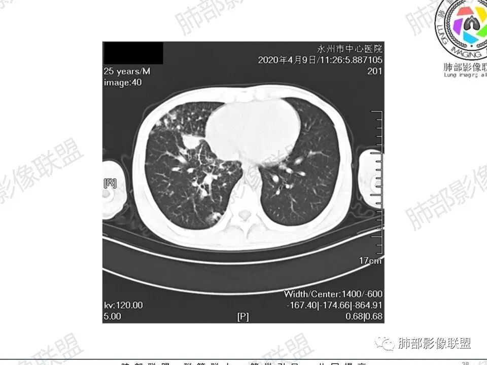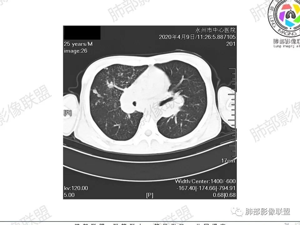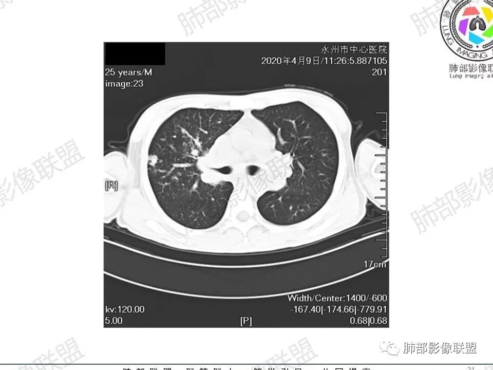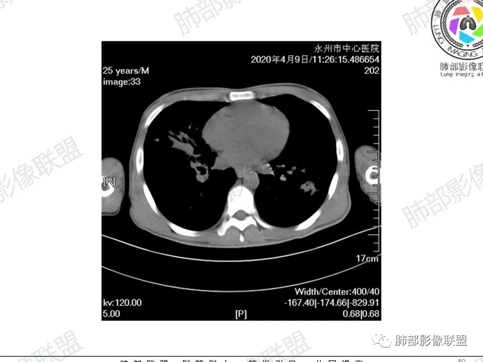 3.双肺多发结节影,没有明显的新旧不等,没有钙化,微小结节影密度偏低,边缘不够僵硬锐利;病灶区域穿行支气管显示良好,未见壁增厚及管腔狭窄,加之病灶如此广泛,病灶未见收缩、肺叶体积未见缩小,结核中毒症状不明显等等都不支持结核。