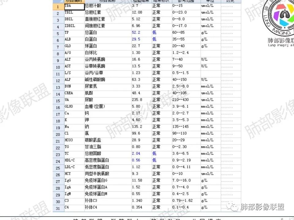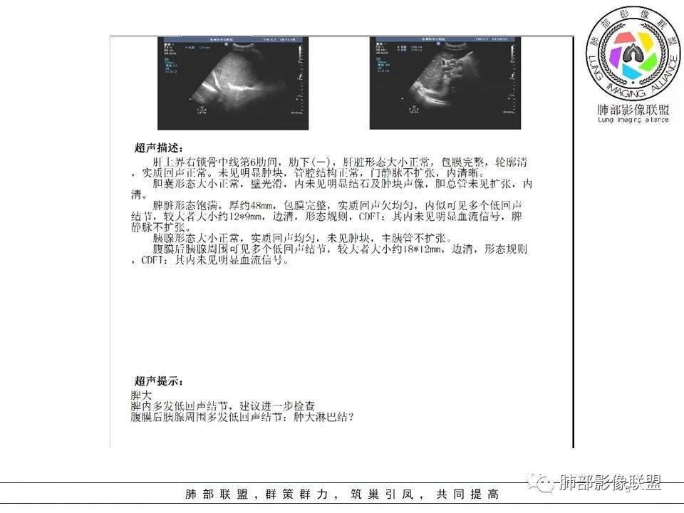 3、影像表现:双肺散在斑片影及结节影,部分结节内可见血管穿行,斑片影沿支气管血管束分布,近胸膜侧病变收缩不明显。部分中央淋巴间质增厚,小叶间隔增厚。病灶内支气管穿行,部分支气管略扩张。局部小结节呈串珠样改变。纵隔、肺门区、锁骨上及腋窝淋淋巴结肿大,部分有融合。心腔低密度。脾大。
