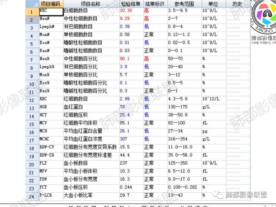2、实验室检查:低色素性贫血,血沉快,铁蛋白明显增高,凝血功能降低,蛋白降低,乙肝表面抗原阳性,叶酸低,CRP 高,白细胞及中性高。