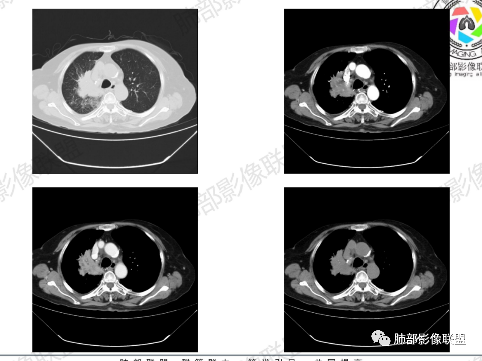 临床信息:老年女性,亚急性病程,咳嗽发热。有激素使用史。既往有淋巴结结核病史。肿瘤标记物Ca125升高。血沉升高,C反应蛋白轻度异常。 影像所见:右侧胸廓相对狭小,右肺上叶不规则团块影贴附纵隔旁,轻度分叶,整体密度较均匀,偶见钙点。