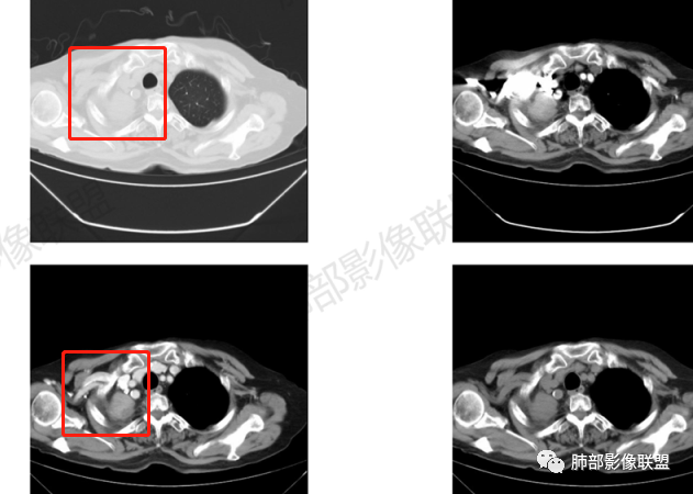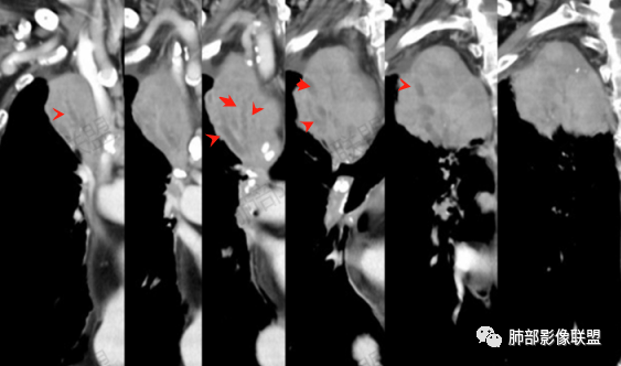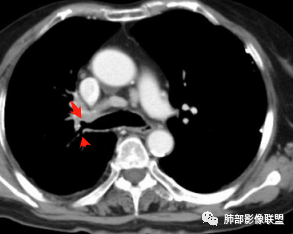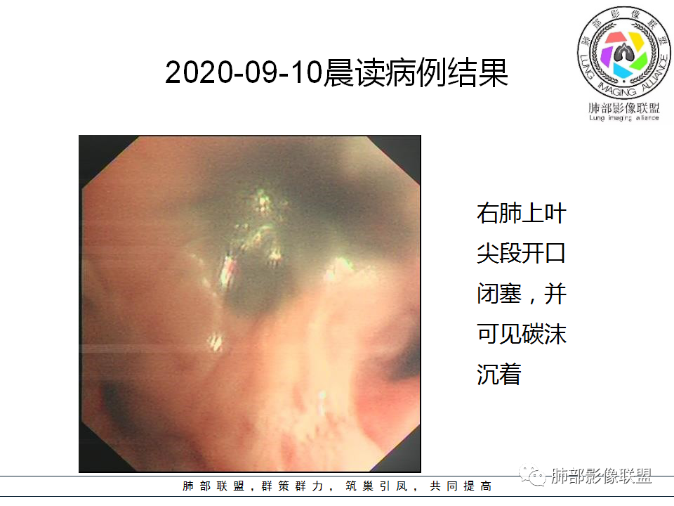 相应上叶尖端及前段支气管开口未能追踪(阻塞),开口处见钙化。病灶渐进性强化,并衬托出较完整尖段及前段含液支气管影。支气管开口区域未见异常高密度强化(如类癌等)及相对乏血供区(如鳞癌)。病灶区未见液化坏死。右上纵隔及胸廓入口区未见病灶胸膜外突破(栽赃)。