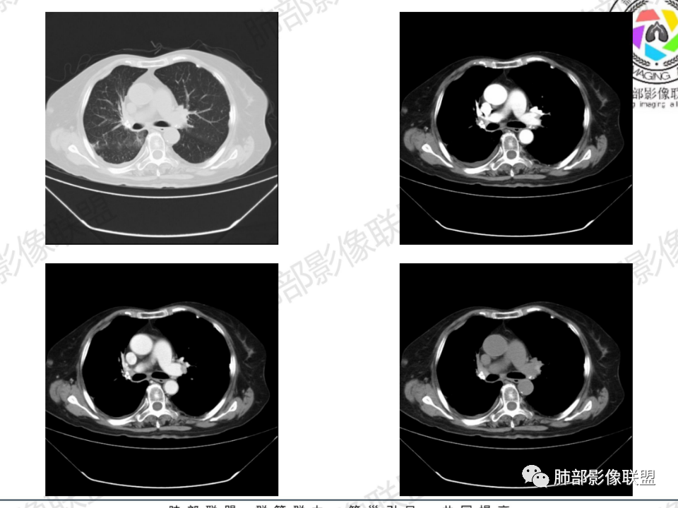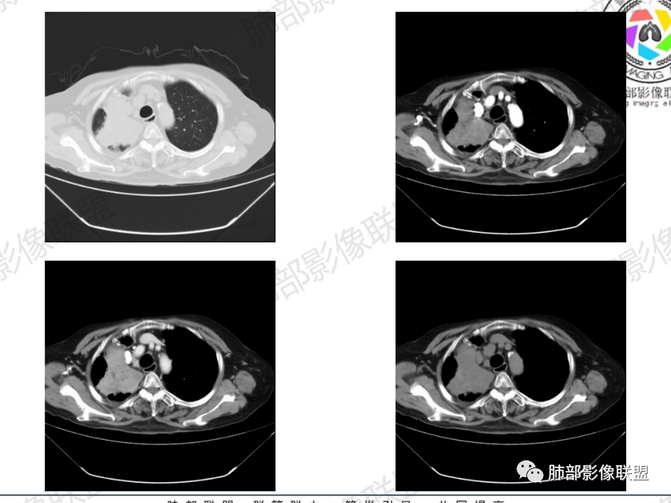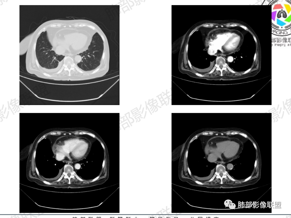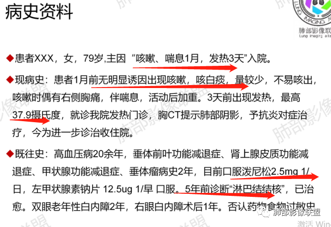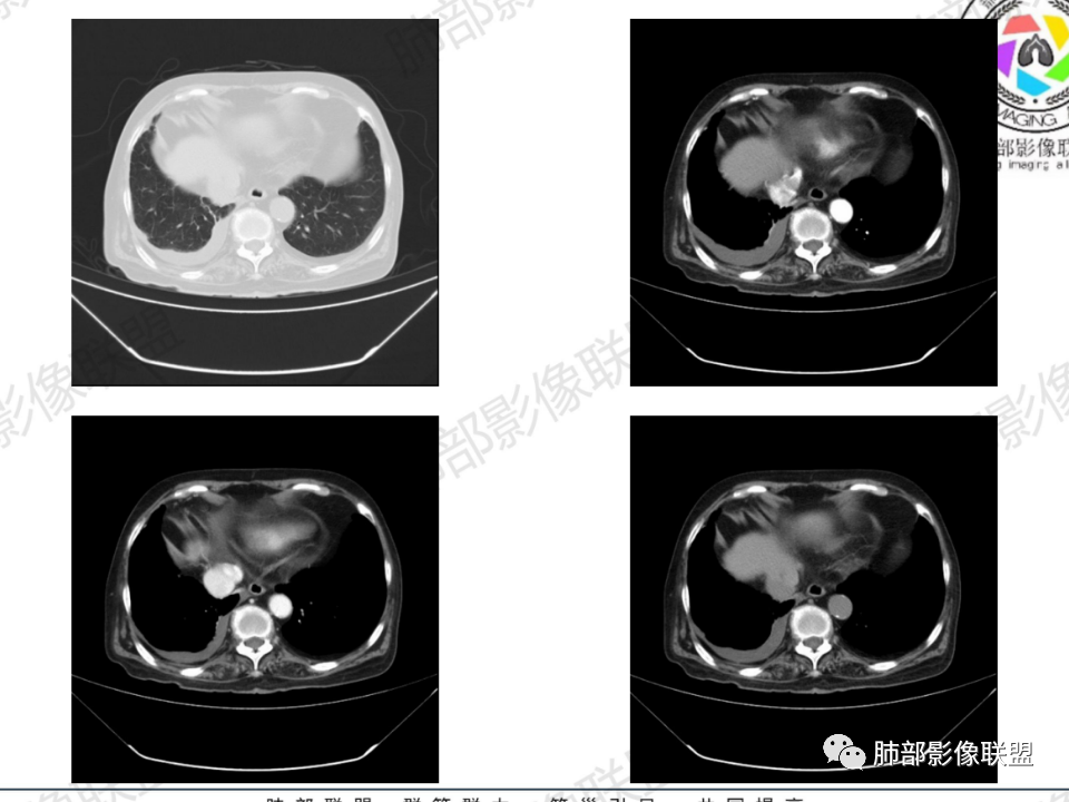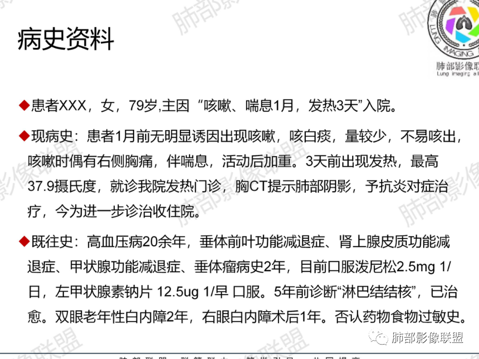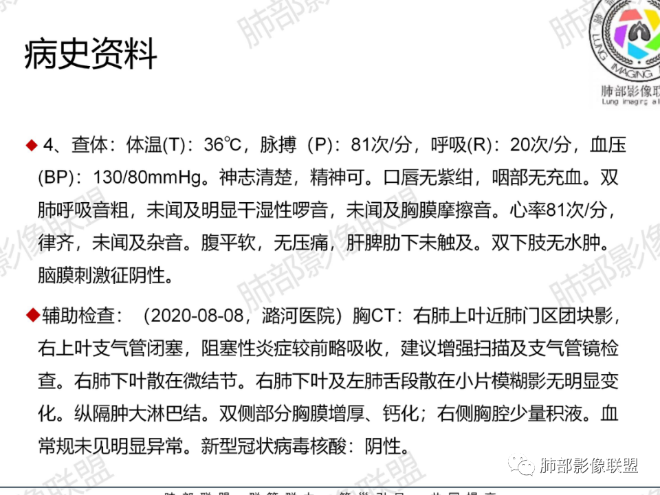 纵隔及双肺门见钙化淋巴结。心包积液,右侧胸腔积液(提示存在活动新病灶)。双侧胸膜下见多发斑点状钙化,胸廓变形(提示存在结核基础病变可能)。 诊断意见:综上,右肺上叶块状影更符合继发性肺结核。 最后小结:既往诊断淋巴结结核,提示已治愈。近2年服用激素,可疑诱导结核复燃,也可引起发热。纵隔肺门淋巴结肿大钙化,压迫支气管,右肺上中下叶支气管均狭窄,所以引起喘息咳嗽。尖段支气管受累闭塞,导致肺不张、支气管粘液栓,出现条状无强化区。病变累及胸膜,导致结核性胸膜炎并胸水,引起右侧胸痛。实验室检查血沉快,CA125高,低蛋白,均符合结核。下一步,建议支气管镜尖段支气管刷检并抗酸染色。(本段摘自於雄老师精彩发言)