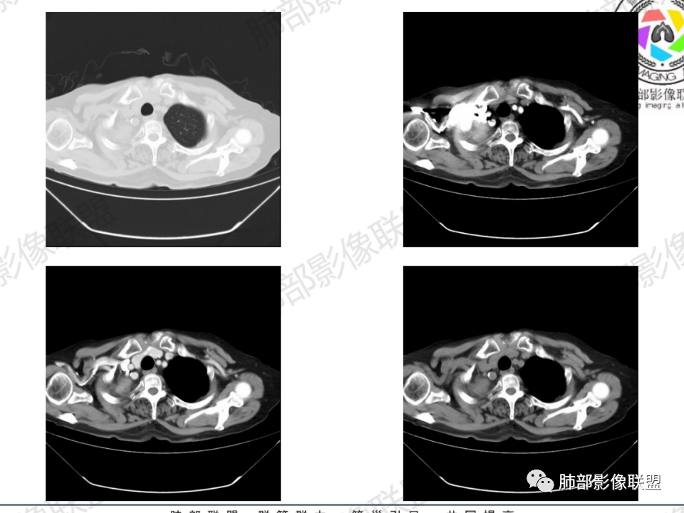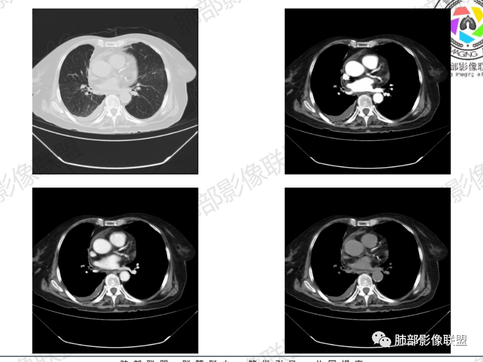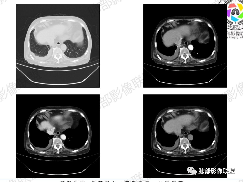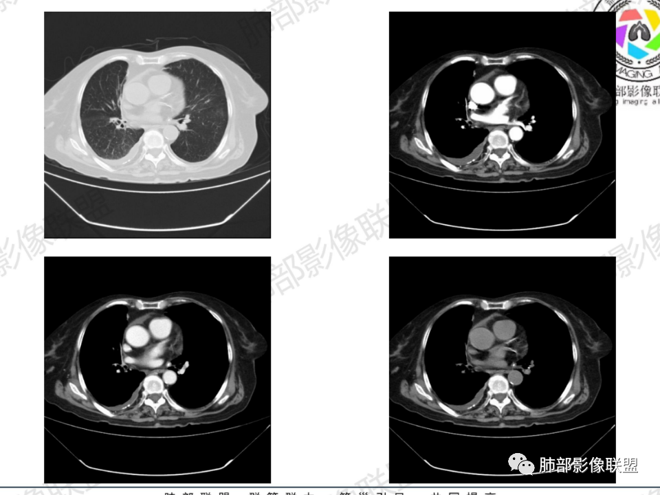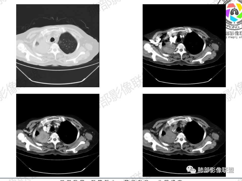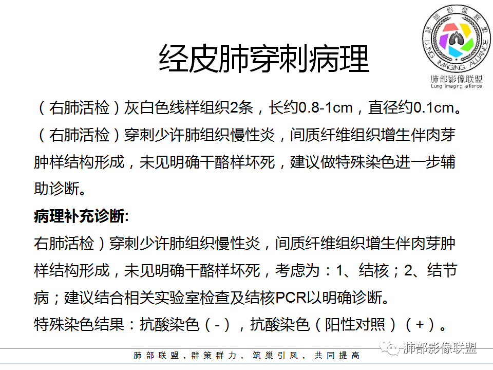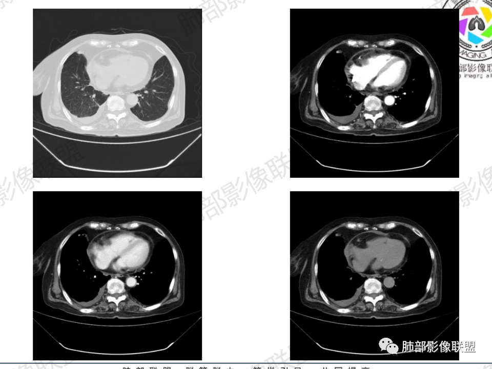 纵隔及双肺门见钙化淋巴结。心包积液,右侧胸腔积液(提示存在活动新病灶)。双侧胸膜下见多发斑点状钙化,胸廓变形(提示存在结核基础病变可能)。 诊断意见:综上,右肺上叶块状影更符合继发性肺结核。 最后小结:既往诊断淋巴结结核,提示已治愈。近2年服用激素,可疑诱导结核复燃,也可引起发热。纵隔肺门淋巴结肿大钙化,压迫支气管,右肺上中下叶支气管均狭窄,所以引起喘息咳嗽。尖段支气管受累闭塞,导致肺不张、支气管粘液栓,出现条状无强化区。病变累及胸膜,导致结核性胸膜炎并胸水,引起右侧胸痛。实验室检查血沉快,CA125高,低蛋白,均符合结核。下一步,建议支气管镜尖段支气管刷检并抗酸染色。(本段摘自於雄老师精彩发言)