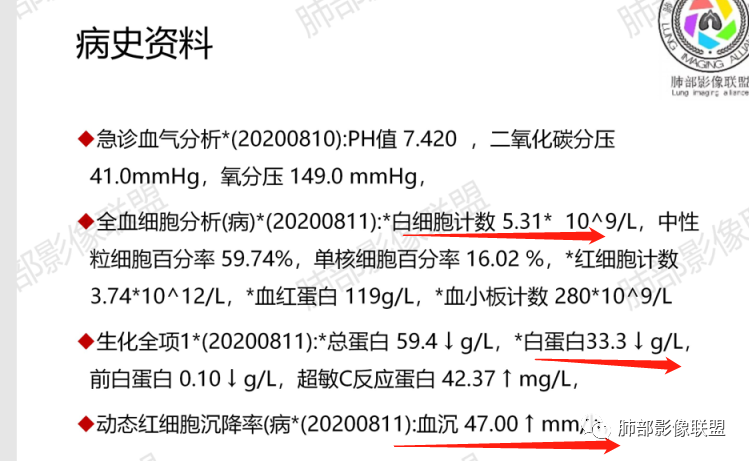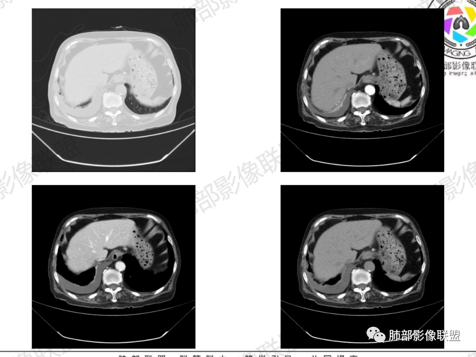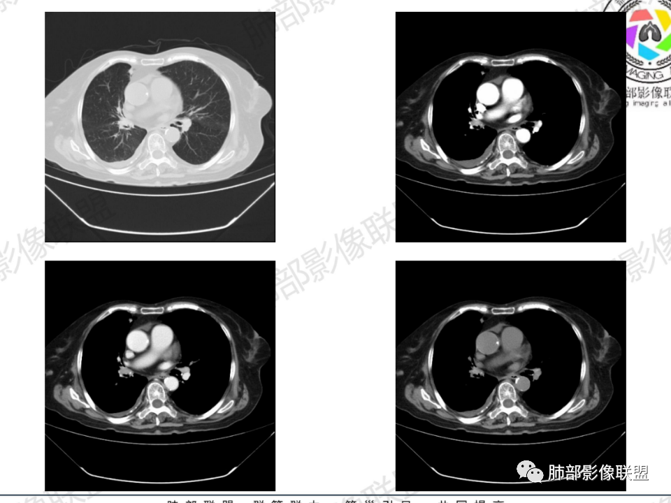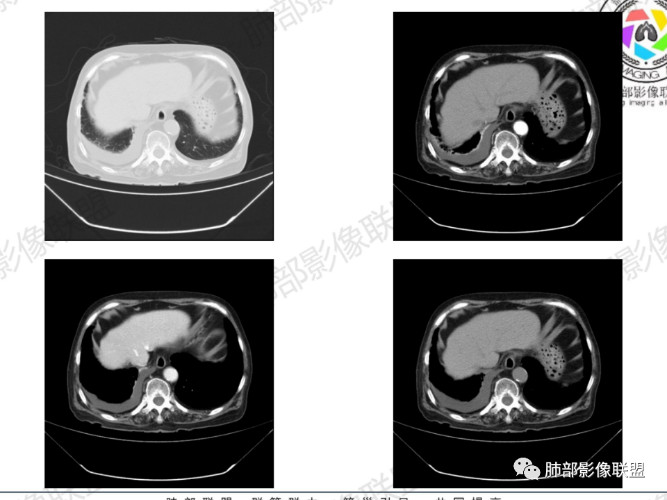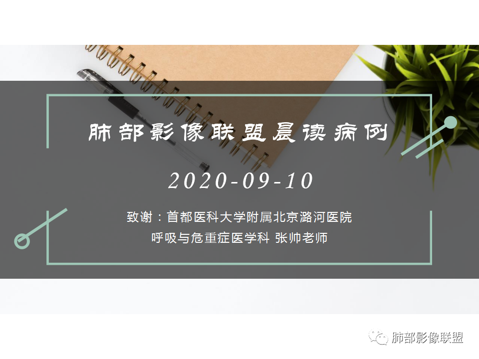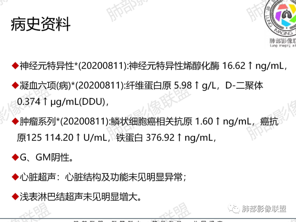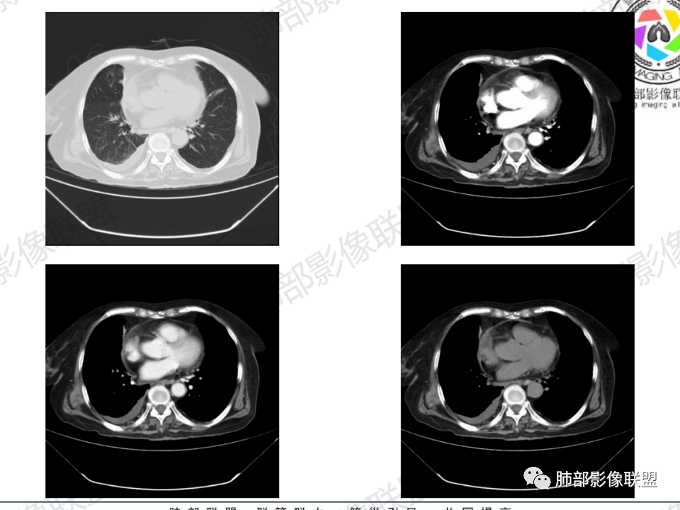 纵隔及双肺门见钙化淋巴结。心包积液,右侧胸腔积液(提示存在活动新病灶)。双侧胸膜下见多发斑点状钙化,胸廓变形(提示存在结核基础病变可能)。 诊断意见:综上,右肺上叶块状影更符合继发性肺结核。 最后小结:既往诊断淋巴结结核,提示已治愈。近2年服用激素,可疑诱导结核复燃,也可引起发热。纵隔肺门淋巴结肿大钙化,压迫支气管,右肺上中下叶支气管均狭窄,所以引起喘息咳嗽。尖段支气管受累闭塞,导致肺不张、支气管粘液栓,出现条状无强化区。病变累及胸膜,导致结核性胸膜炎并胸水,引起右侧胸痛。实验室检查血沉快,CA125高,低蛋白,均符合结核。下一步,建议支气管镜尖段支气管刷检并抗酸染色。(本段摘自於雄老师精彩发言)