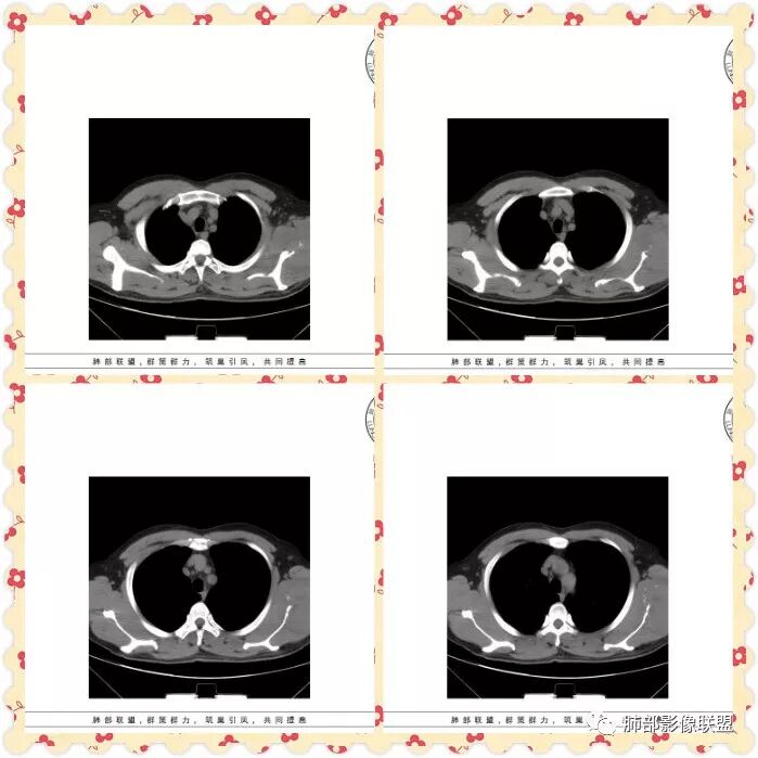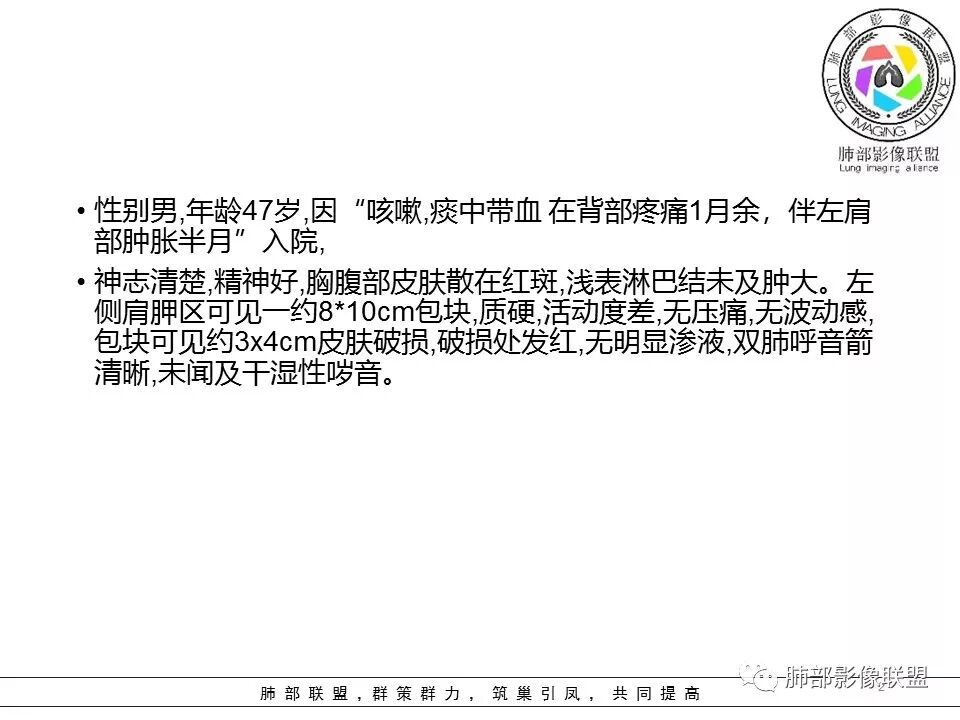 47岁男性,咳血痰左肩背痛1月余,左肩胛骨破坏,破坏处及周边见软组织肿块,左肩胛区包块并皮肤破损,破损处无渗液、无脓不支持结核。两肺见多发磨玻璃影,沿血管走行,其内血管明显增粗,部分磨玻璃影内可见点状实性结节,呈点晕征,各磨玻璃影形态密度基本一致,提示同一来源,支气管未见明显增厚扩张——不支持气道来源。小叶间隔无增厚及纵隔未见明显肿大淋巴结——感觉淋巴瘤可能性较小。胸腹部皮肤散在红斑。整体考虑左肩胛骨恶性肿瘤并两肺转移。