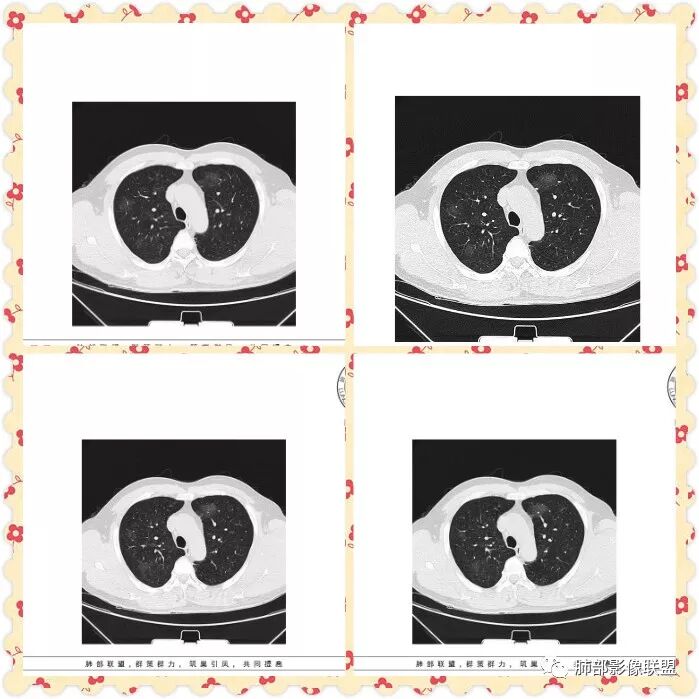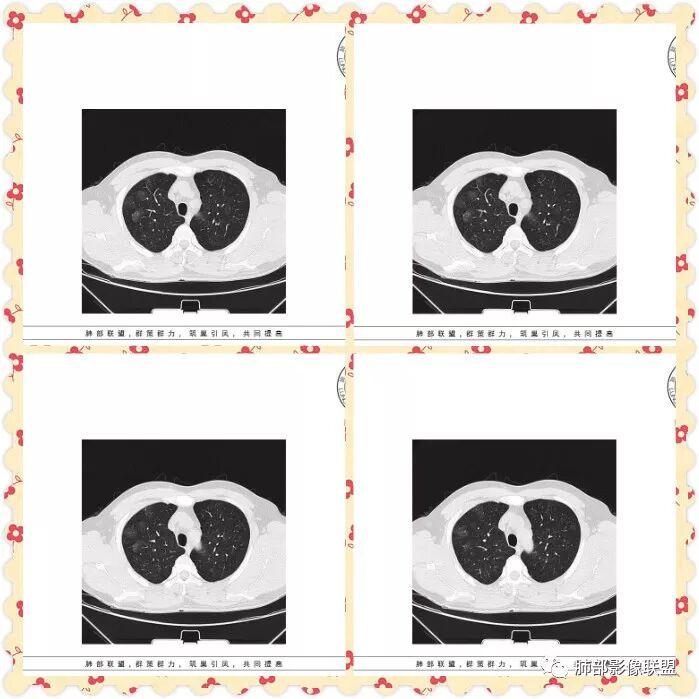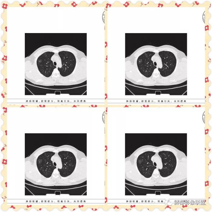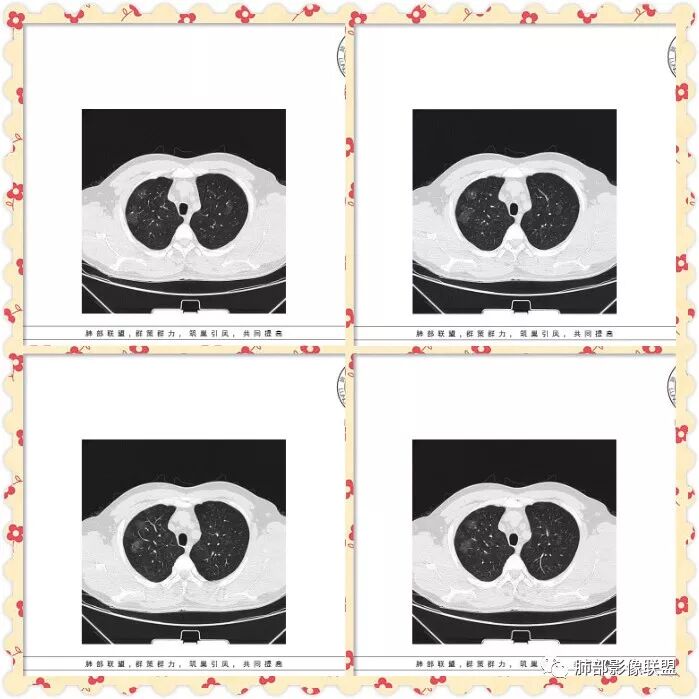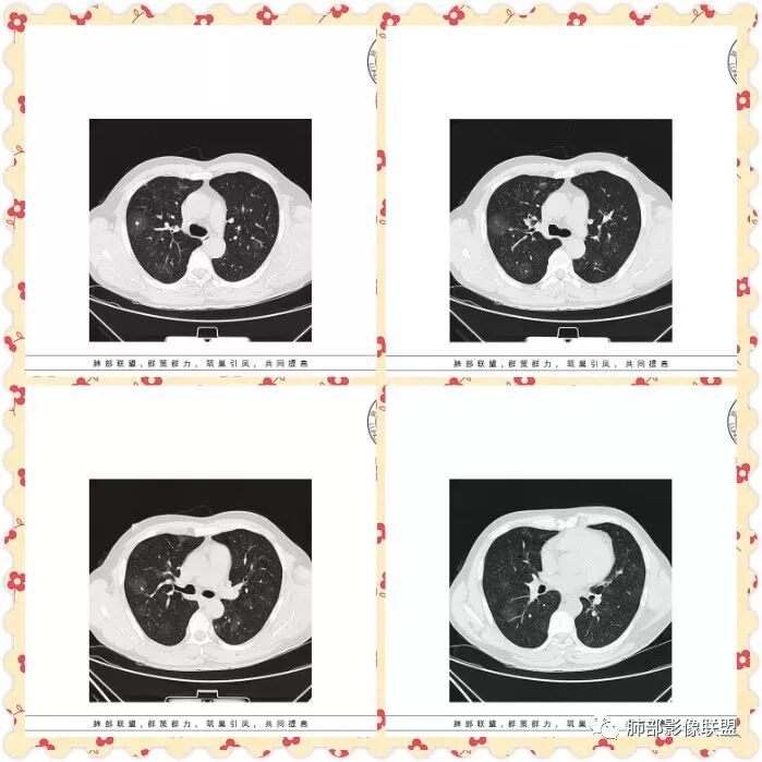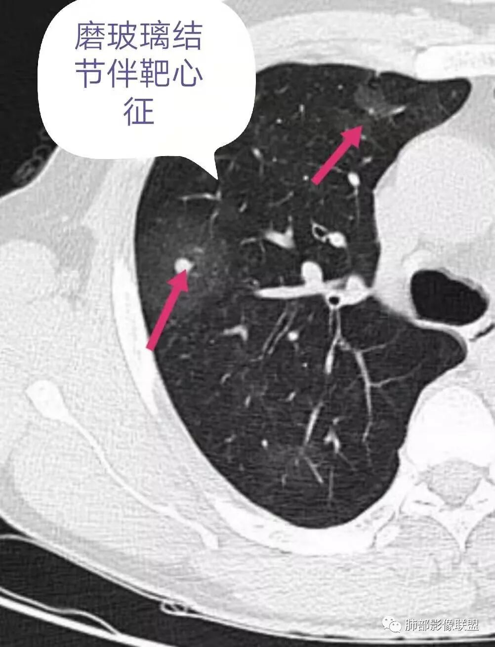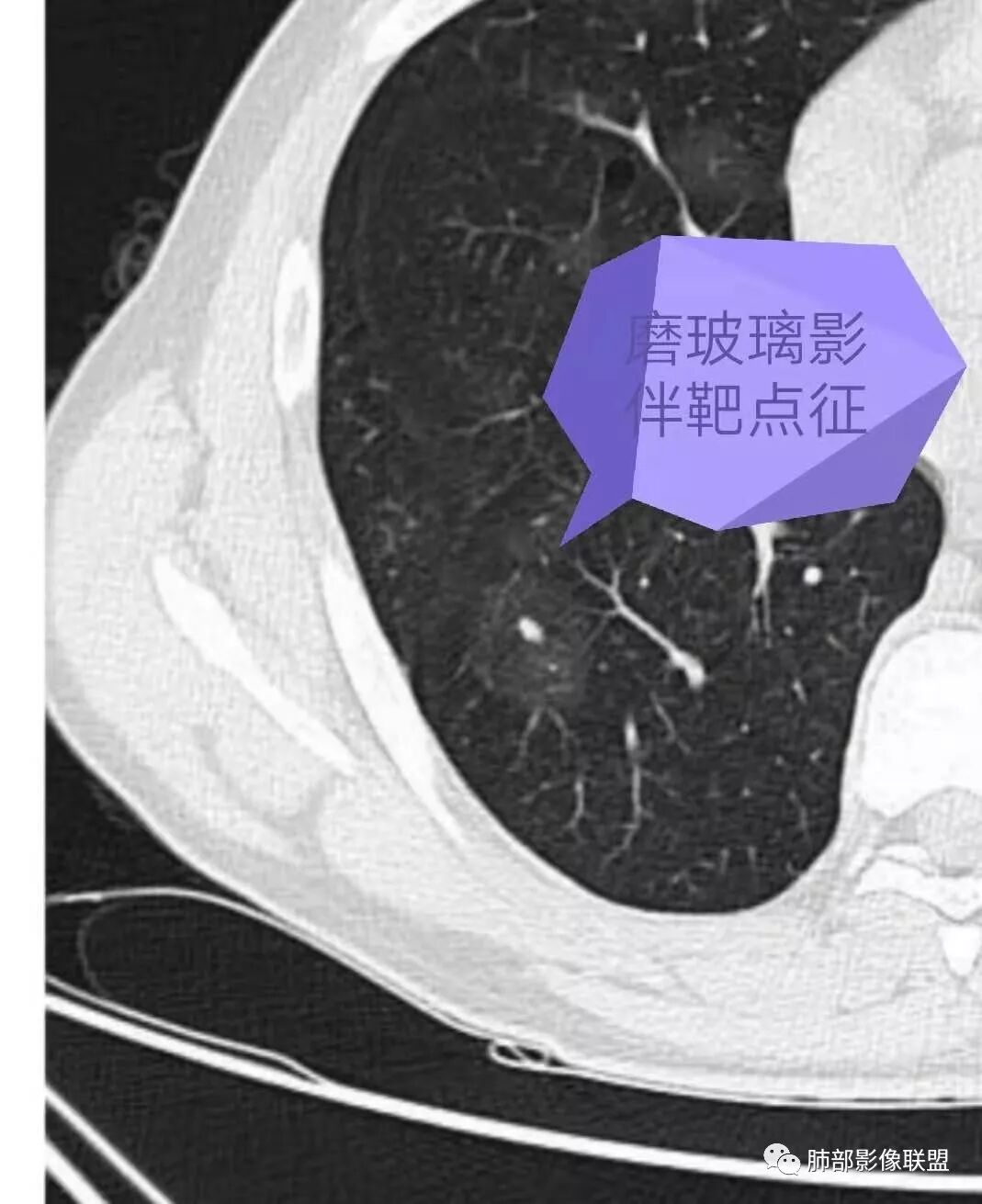 1.双肺多发磨玻璃结节影,边界可分辨,病灶中央都可见一实性密度小结节影,注意不是钙化。这些病灶形态及密度是如此相似,宛如身着厚厚一层晕影蜉蝣深海之中,称之为“点晕征”。