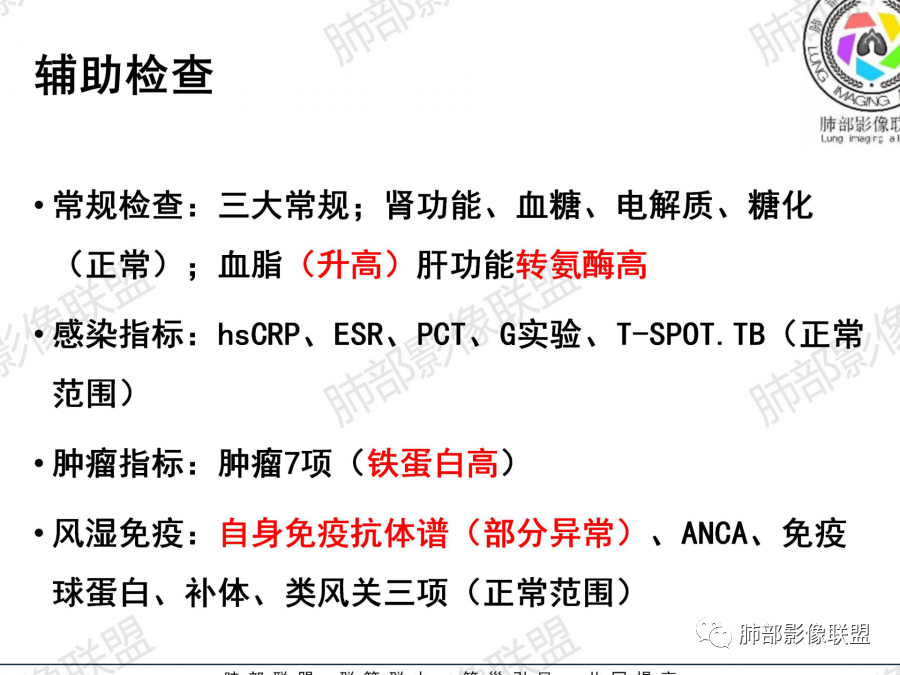 1、青年男性、咳嗽气喘一月,加重两天入院。实验室检查:有铁蛋白增高,血脂、肝功异常、有免疫异常。
