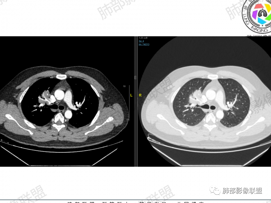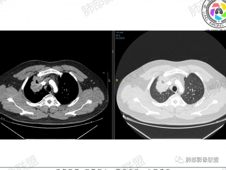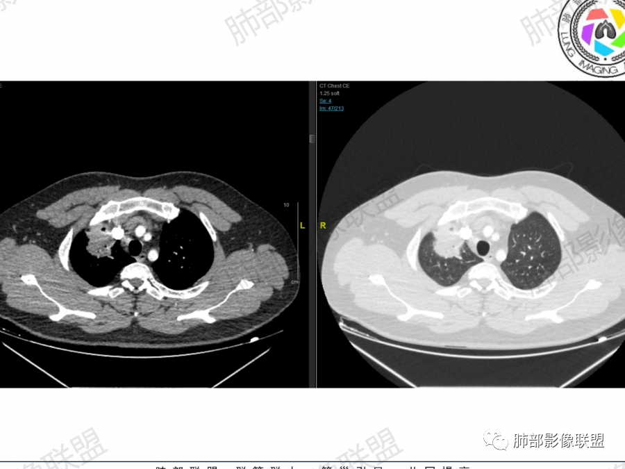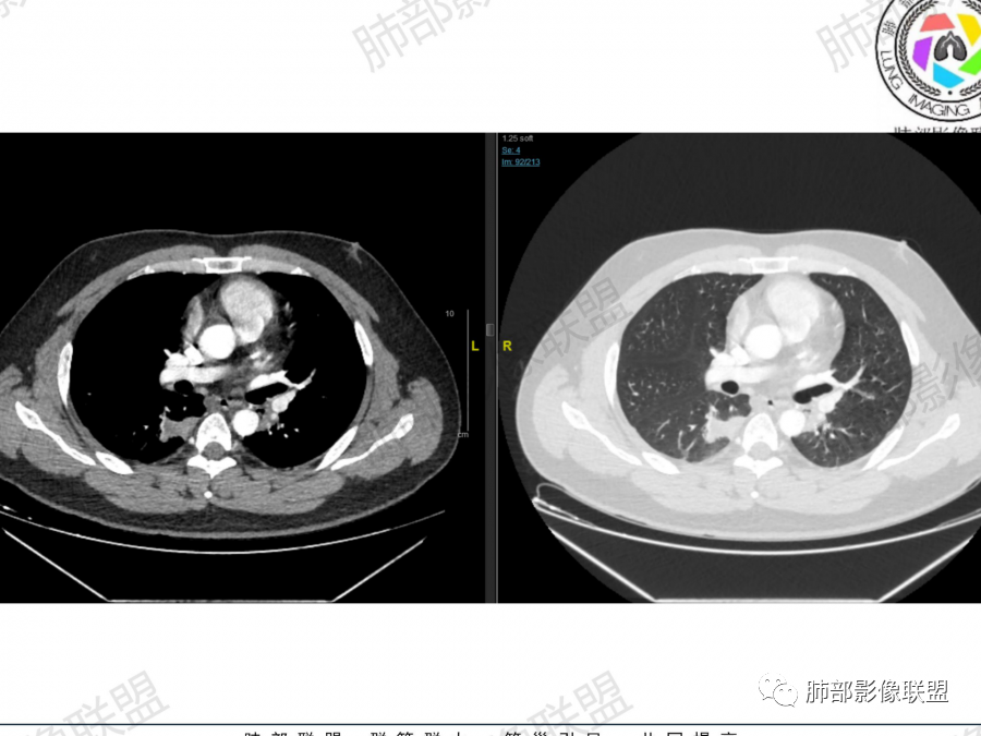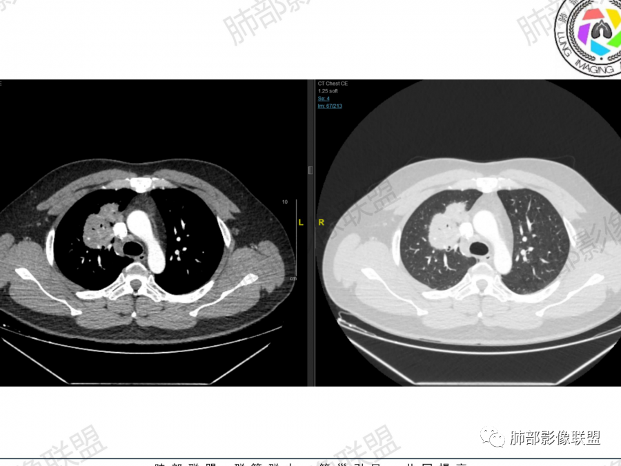 1.右上肺团块:分叶,不均性强化,其内支气管走行自然,增强血管影可见、清晰。