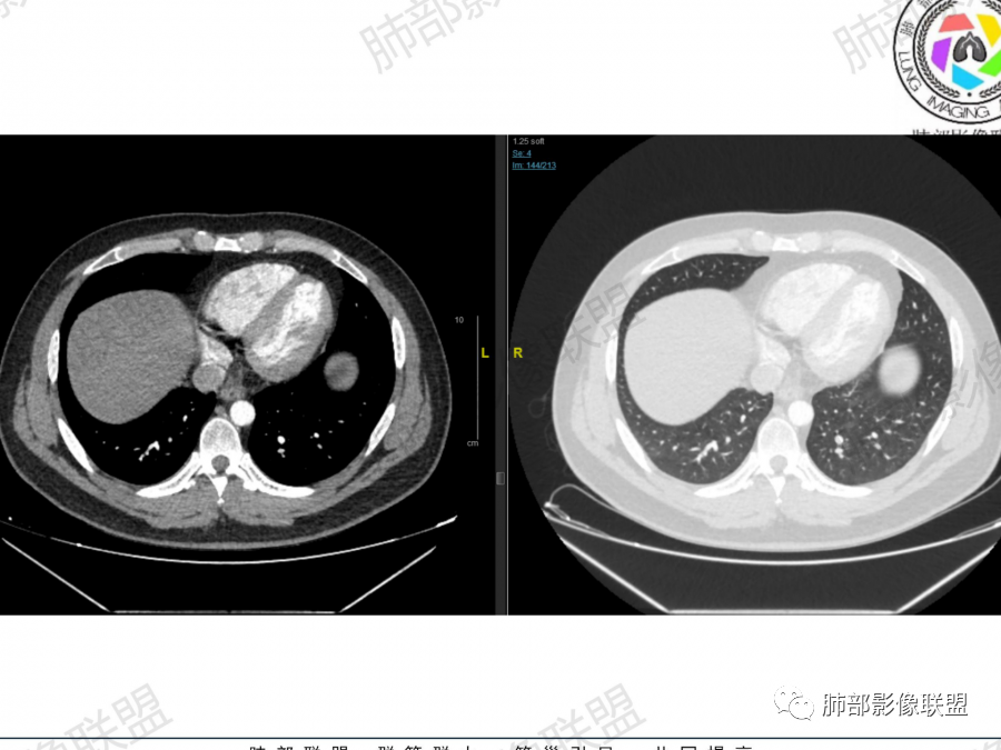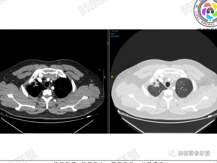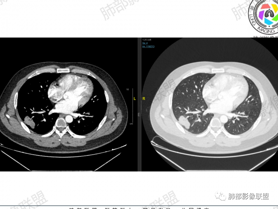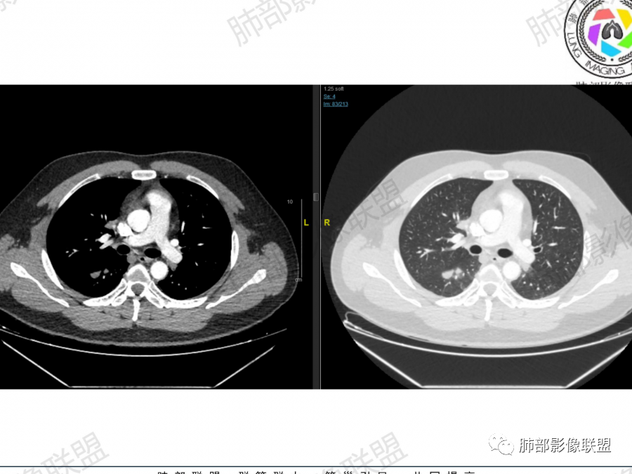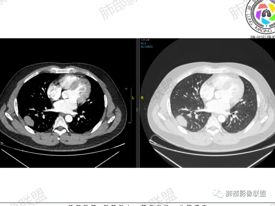 多发结节或实变型:分布多为下叶单叶胸膜下、少数两肺多发、多叶段分布。弥漫型:本例为单侧肺、多叶结节型。