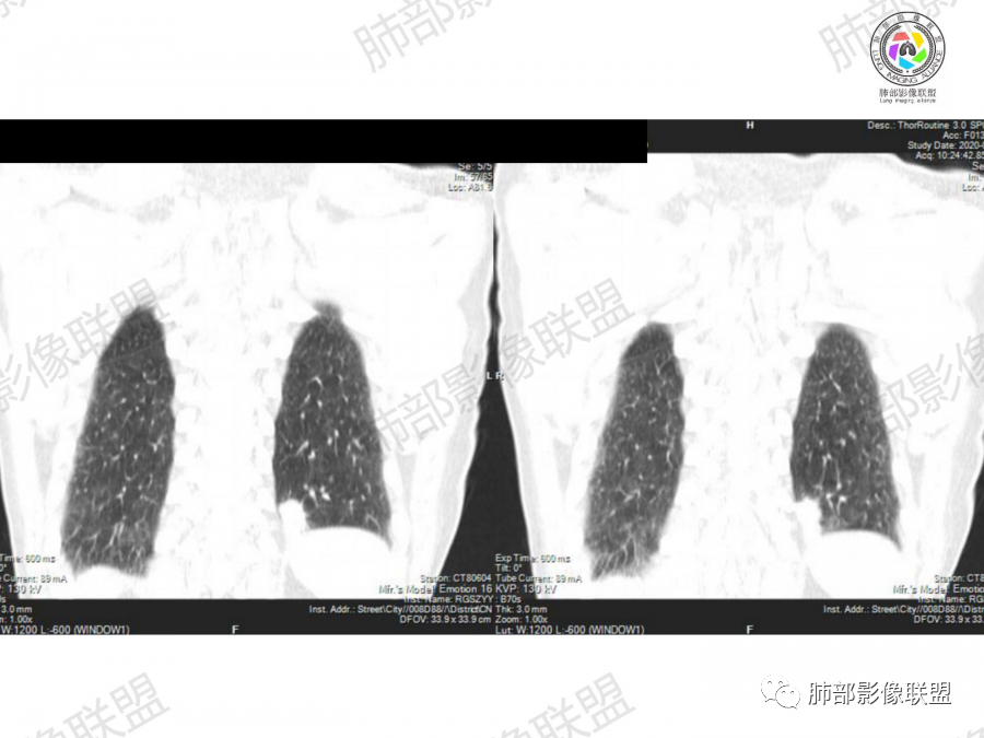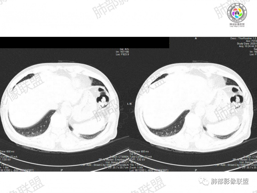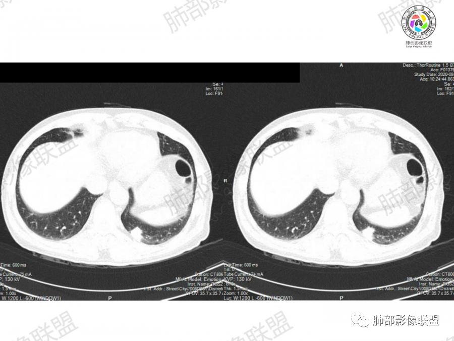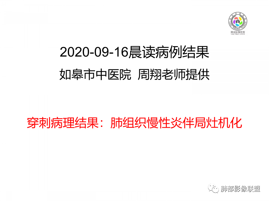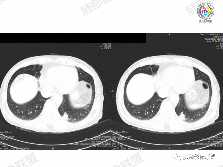该例病变虽然为老年男性,无肺气肿背景,无临床症状、长软毛刺、刀切边缘、糊墙,病灶密度均匀,周围支气管无截断,病灶密度均匀,基本为良性炎性病变特征,但并不是绝对,工作中应该建议治疗后随访排外其它。
