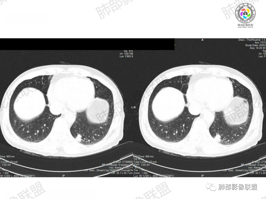 晨读:左下肺病变,边缘平直,糊墙征明显,晕征不明显,首先也要考虑炎性病变,病人不明显症状,考虑慢性炎症,密度好像比较均匀,建议增强,隐球菌多糖荚膜试验。如果要排除肿瘤的话,排除腺癌