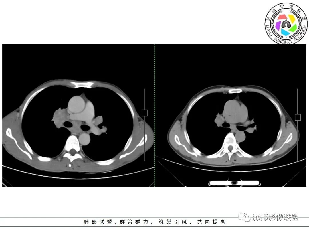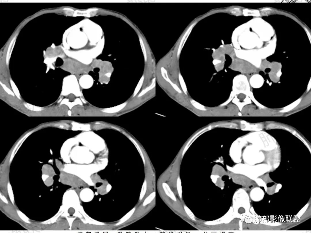 该病例增大淋巴结与周围结构的毗邻关系是有特征性的,结合强化特点,可简单排除结核、淋巴瘤和小细胞癌