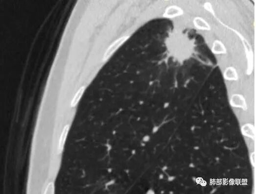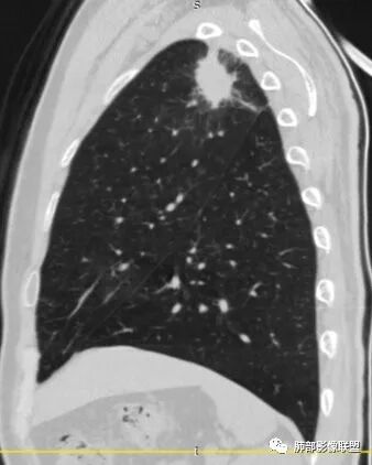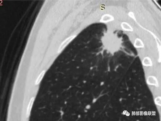 左肺尖实性病灶,边缘平直,内见点状钙化,周围见卫星灶,边缘长索条,有支气管截断,首先考虑TB,癌待排