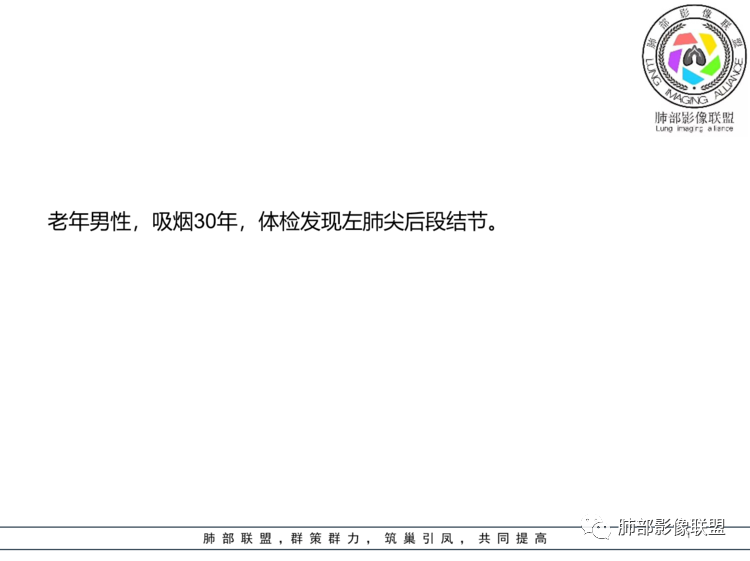 老年男性,左肺上叶尖后段不规则结节,与胸膜相连,胸膜增厚,周边见小结节影及条索影,内部见点状钙化,周边伴细长毛刺,考虑为良性,结核可能