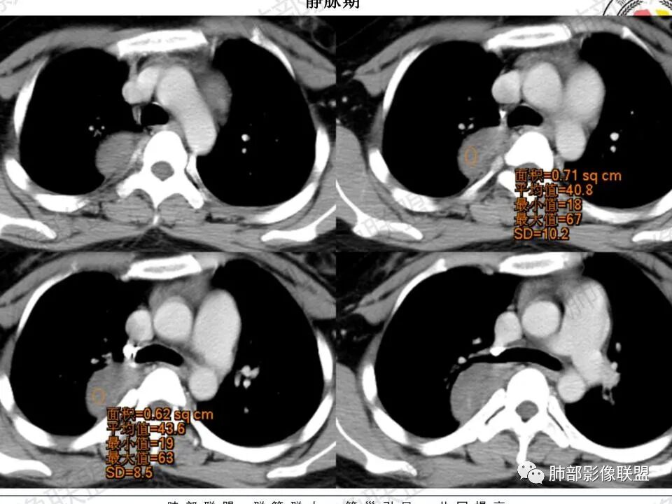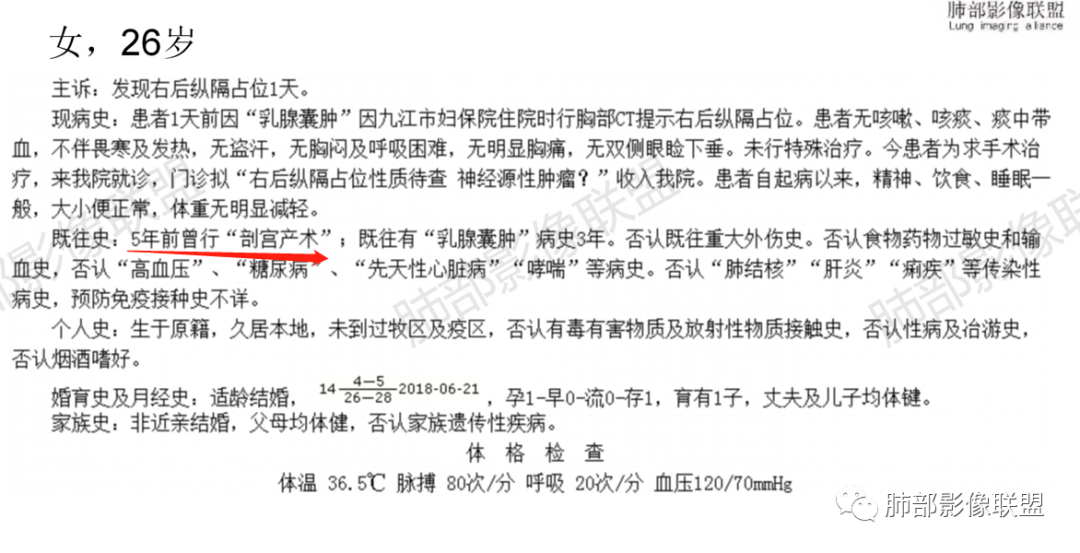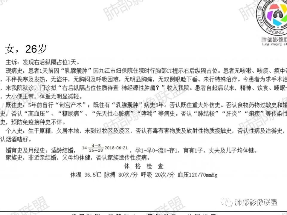 1.青年女性,例行检查发现后纵隔块影,缺乏相关临床症状。