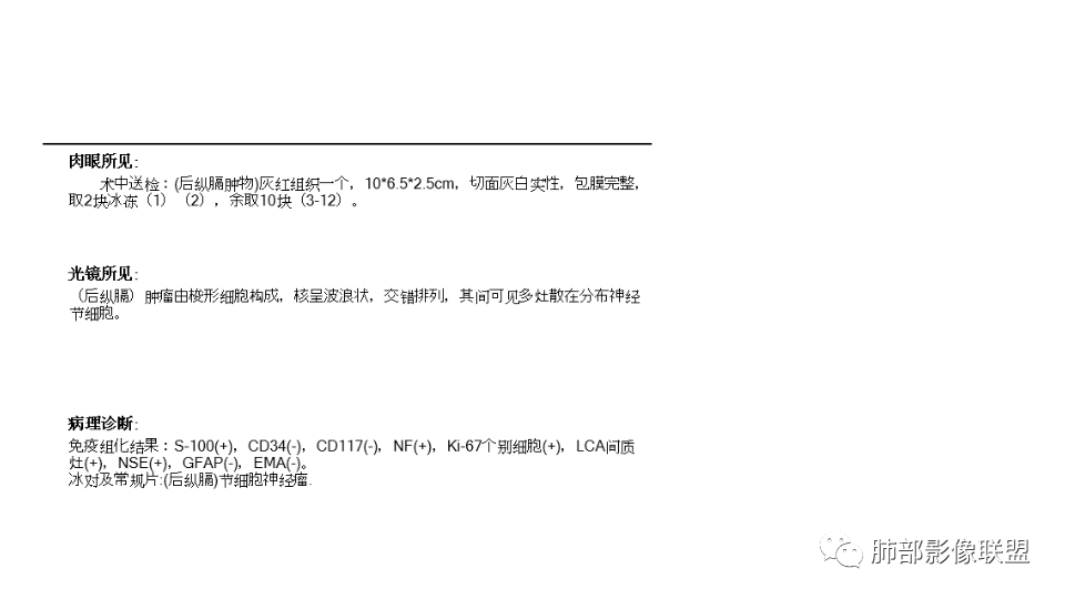 2.肿块含脂肪等成分,与交感神经路径相一致,渐进性轻度强化(可能含有粘液成分)等,以节细胞神经瘤最可能!尽管未显示“习惯性”的钙化。