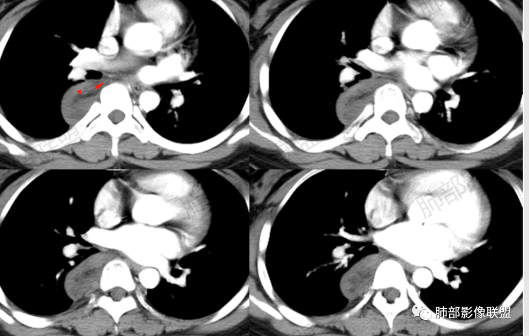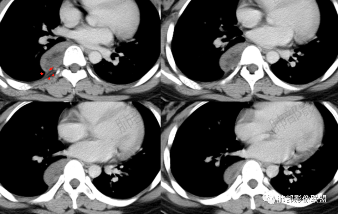 3.块影血供动脉来自肋间动脉,且由内后方侧入,其与下腔静脉之间未见回流通道。血管未见破坏,相邻组织未见侵入。