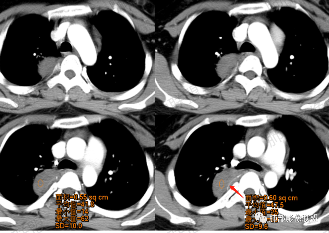 2.后纵隔神经鞘瘤和神经纤维瘤:常呈圆形或椭圆形,对邻近结构呈压迫性改变,常经椎间孔侵入椎管内外生长呈“哑铃形”,钙化罕见,前者易有囊变,后者常为神经纤维瘤病的组成部分,平扫时肿块呈均匀稍低密度,增强扫描轻中度强化,囊变部分不强化。若合并纵隔淋巴结肿大则更倾向于淋巴瘤的诊断。