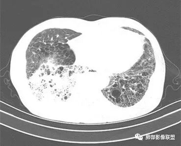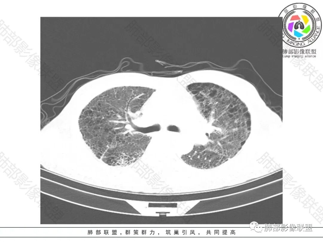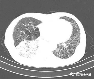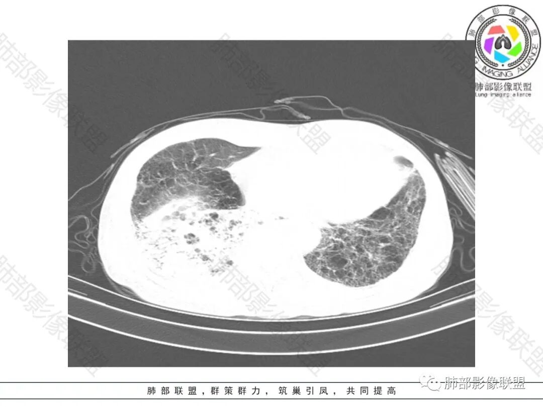 整个背景是一个肺气肿并间质纤维化,肺气肿以上肺为主(有些地方分不清到底是小叶中心或间隔下肺气肿伴间隔增厚还是蜂窝),左肺下叶正常结构消失,以弥漫网格为主,应该没有多少正常肺功能组织。右肺下叶肺动脉栓塞,再往下几层应该是肿大淋巴结并坏死。右肺下叶的病变考虑粘液性腺癌, 需与感染鉴别(有没有可能是肺梗死呢?)