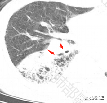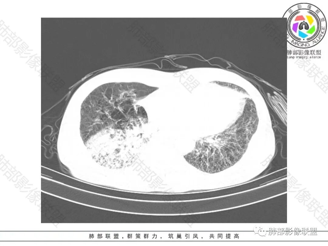间质性肺炎背景,还合并有小叶中心性,间隔旁型气肿,右下叶除了间质性肺炎外,还有实变、空泡、支扩、叶裂膨隆等改变,环形淋巴结强化,综合考虑:肺结核、肺克合并感染,鉴别:吸烟者粘液腺癌多见吗?