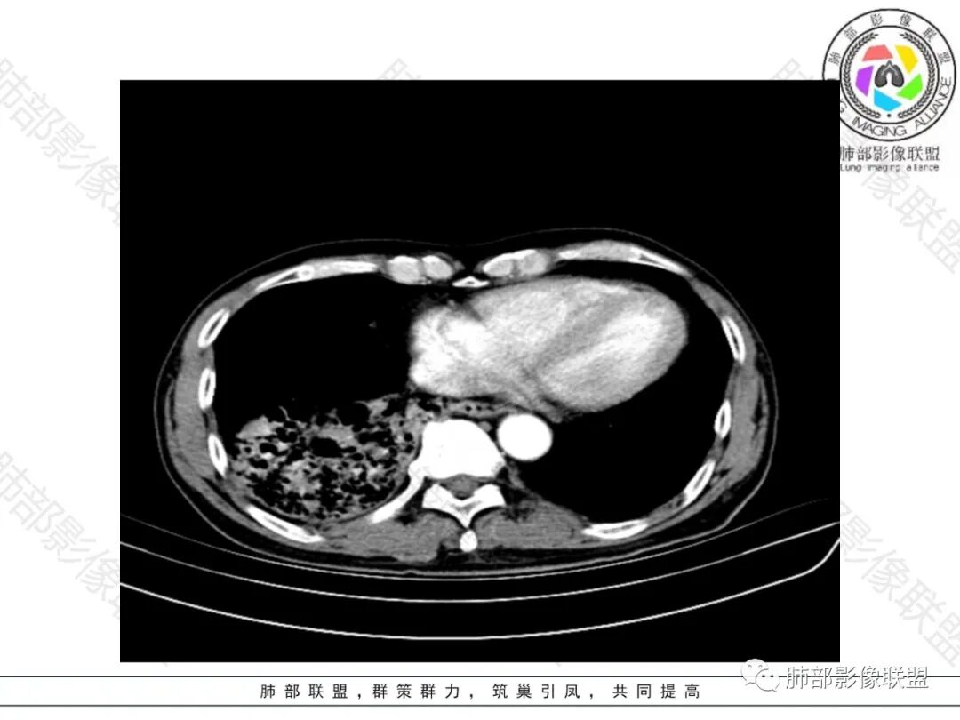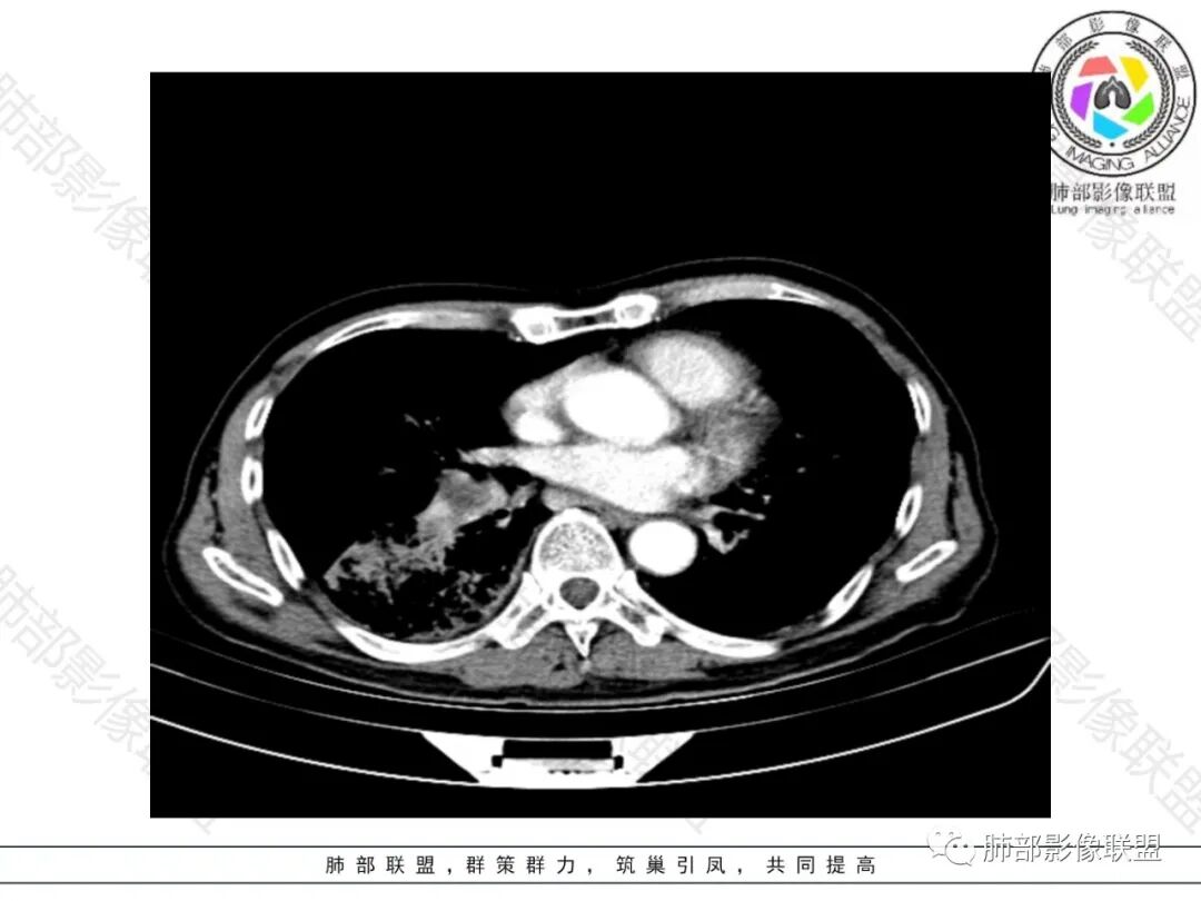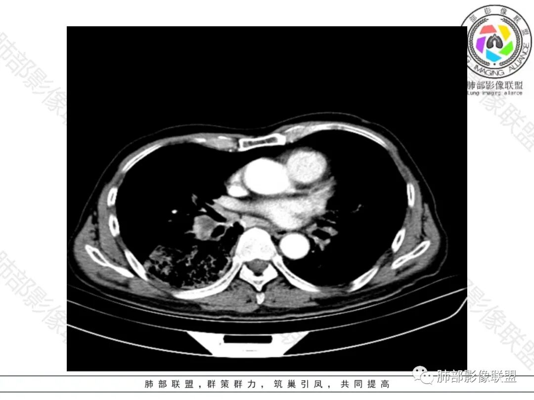 既往慢阻肺病史,反复加重,治疗有效,胸部影像提示双肺间隔旁型肺气肿,也符合基础性疾病。本次病程为喘息加重10天,发热半天,为急性病程,有白色痰,相关感染指标升高,但白细胞和CRP升高比例不同步,胸部影像右肺下叶大片实变影,有膨隆感,原有的空洞考虑既往的肺气肿区域未完全填充的原因。但右肺10-12组淋巴结肿大,其内有低密度影,成环形强化,中叶支气管,下叶支气管狭窄管壁浸润感,不能用普通感染解释,需要考虑局部鳞癌?结核?