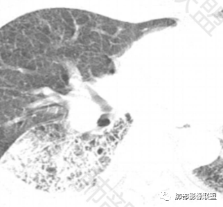 2.影像表现:肺气肿背景,右肺下叶呈现明显网格影及蜂窝影、枯枝征,边缘膨隆、叶间裂向前方推移。病灶密度不均,前份见不规则片状实性密度区,实性部分轻度强化,边界不清,周边特征掩盖不清。支气管主要分支显示,呈枯枝征。纵隔窗病灶密度偏低,病灶内血管影边缘稍显模糊,未见明显液化坏死区。