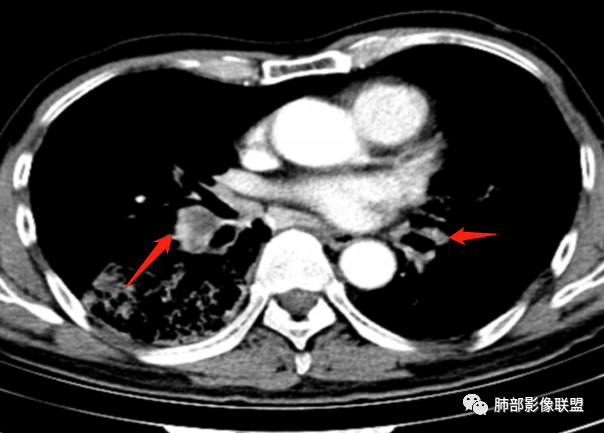 淋巴结大,环形强化;淋巴结压迫支气管所致引流不畅?还是肺内病灶引起淋巴结肿大?