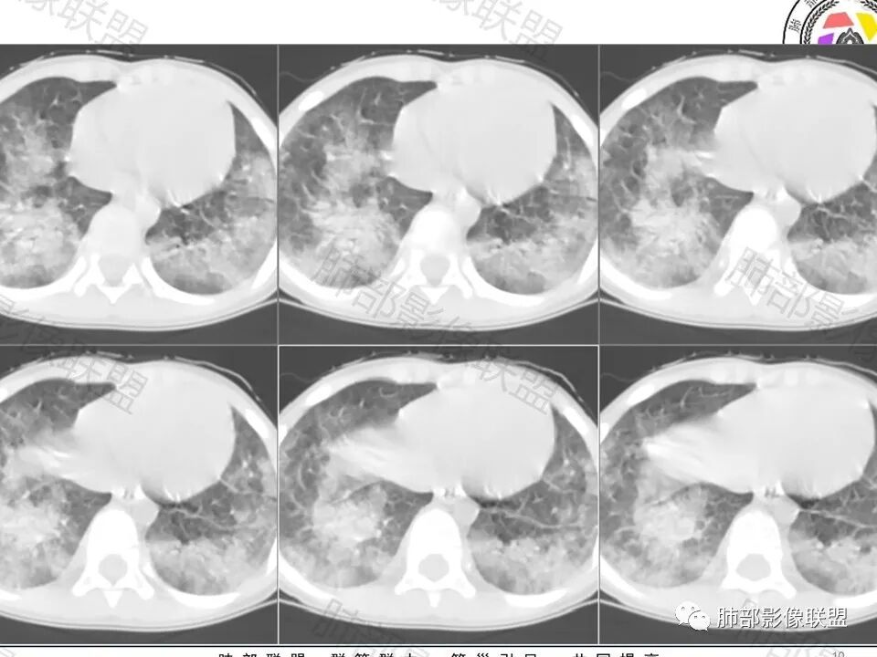 一.双肺广泛磨玻璃片影,边界可分辨,状如“补丁”,背侧分布为主,但胸膜下存在间隙。偶见小结节影。不符合常见的肺水肿及间质性肺病等。结合临床表现,是可以符合肺出血改变的,尽管影像尚需排除其他。