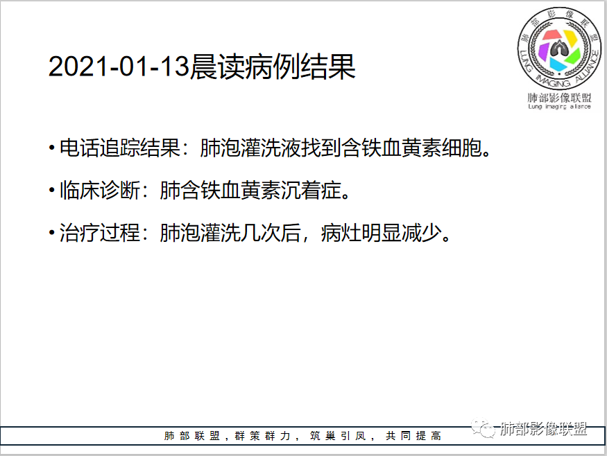 少儿发病则似乎更指向肺特发性含铁血黄素沉着症,但“特发性”的诊断必须建立在排除其他已知病变基础之上,即便是BALF或是病理找到含铁血黄素细胞。