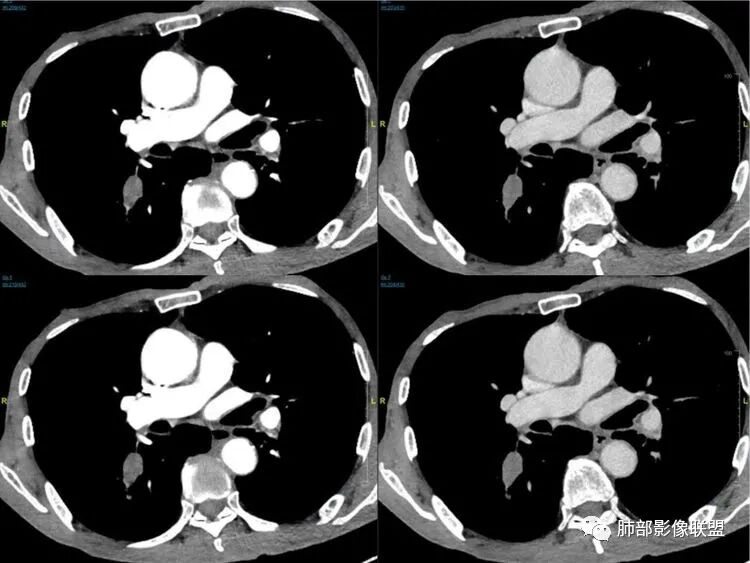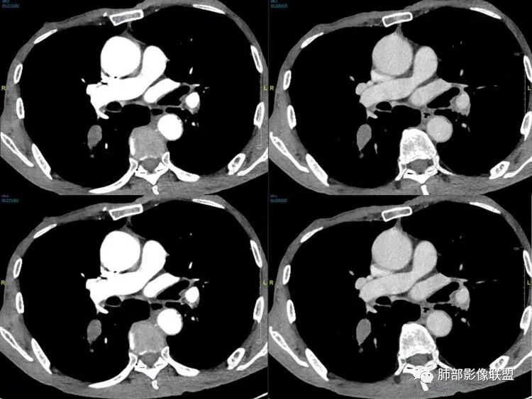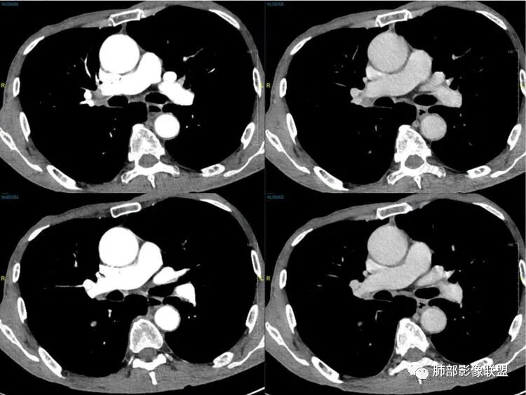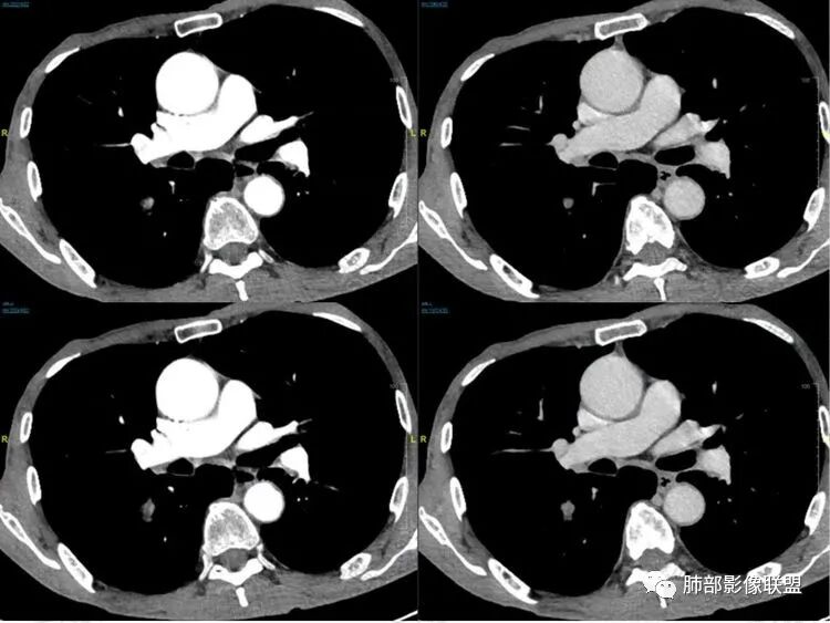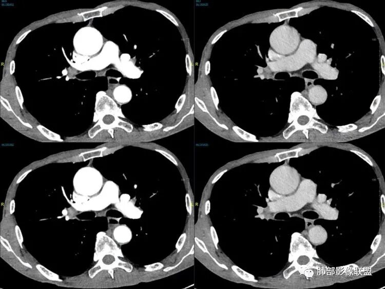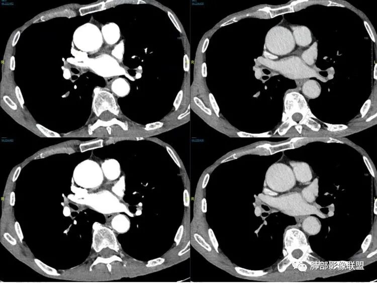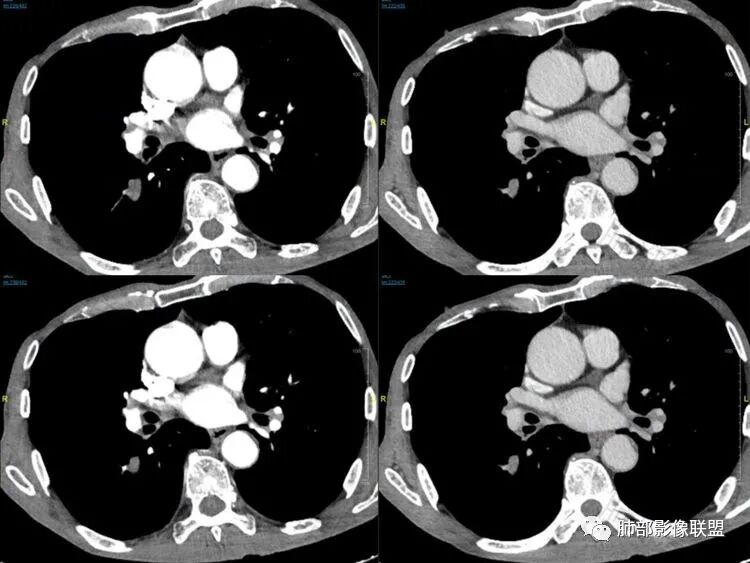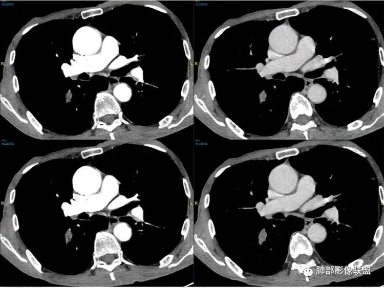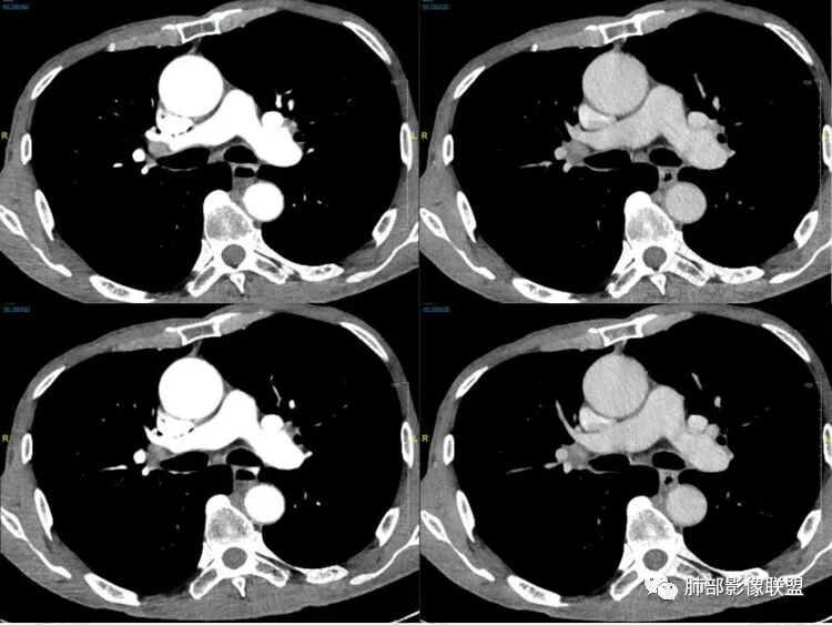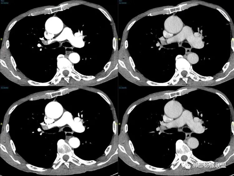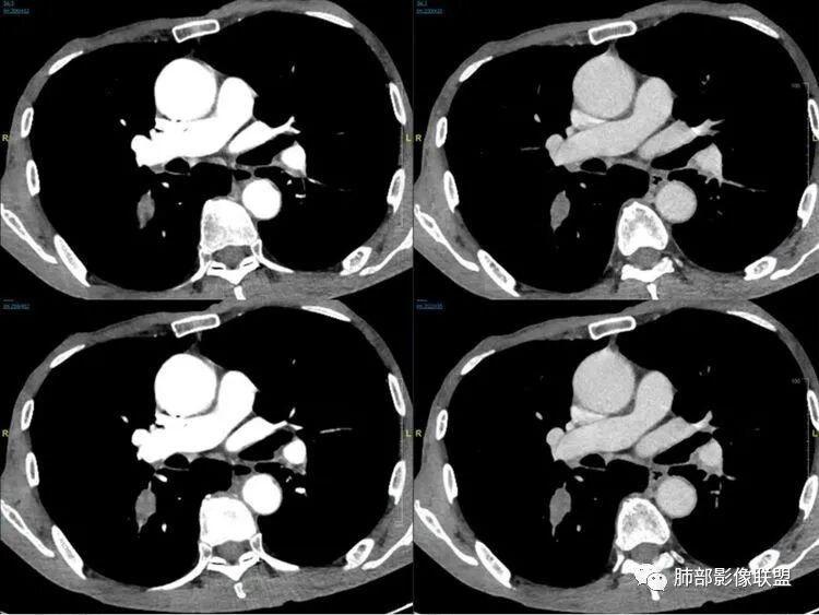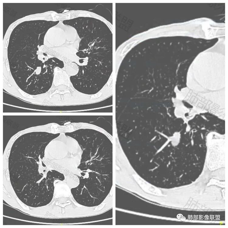 呈典型管状改变,近端支气管堵塞、稍扩张,病灶有强化倾向于恶性,没有强化倾向于炎性病变(结核之类);近端呈结节状(鳞癌多一些),这个病例呈管状(小细胞Ca多一些);平扫与强化有差异,有轻度强化,是粘液栓还是血管?