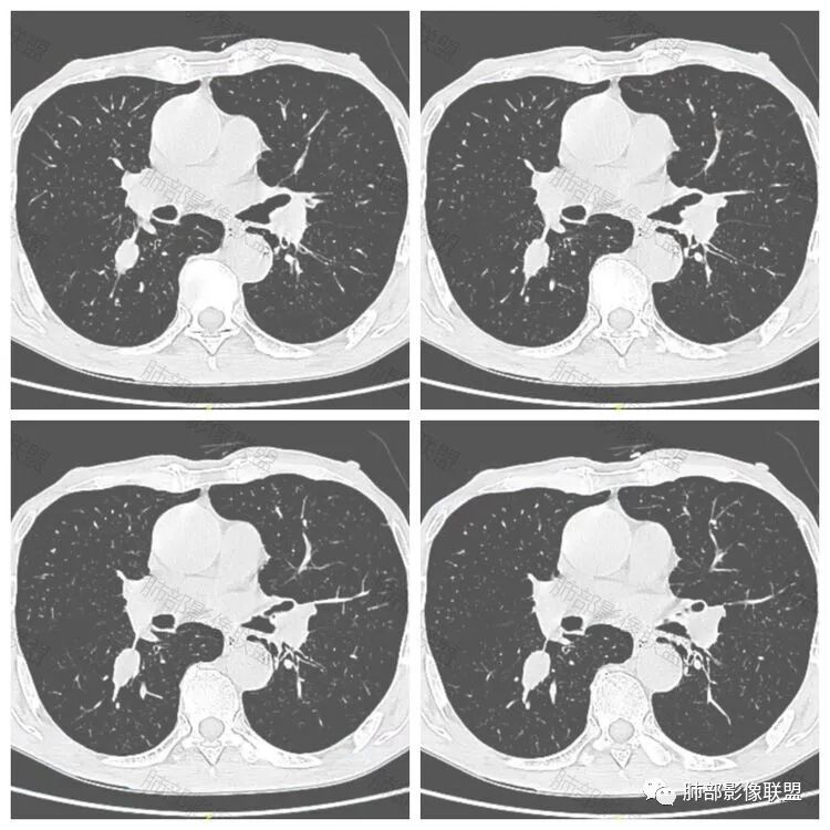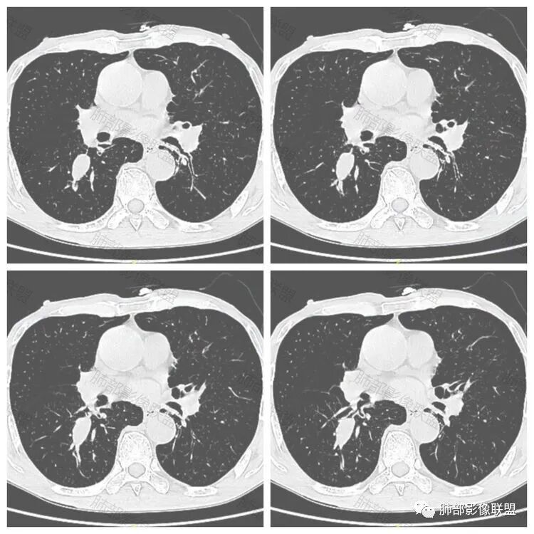 因为病灶沿支气管粘膜下及周围血管生长,走形方向与支气管一致,所以支气管血管周围生长也是SCLC的典型征象。当然有时会像小山丘或者灌汤包一样趴在肺边缘。