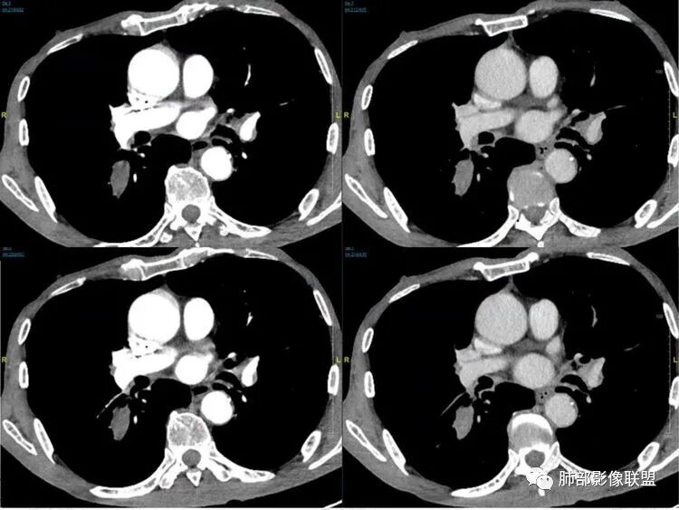 老年男性患者,右肺下叶背段梭形结节影,边界比较光整,密度均匀,没有明显的分叶毛刺,没有阻塞性肺炎的表现,这些感觉具备有良性的特点。而近端支气管截断,增强明显的强化,纵隔多发的淋巴结,显得是恶性的特点。总体印象,老年患者+支气管截断征象+明显强化的结节+纵隔多发淋巴结,还是考虑恶性结节,小细胞癌或是鳞癌。