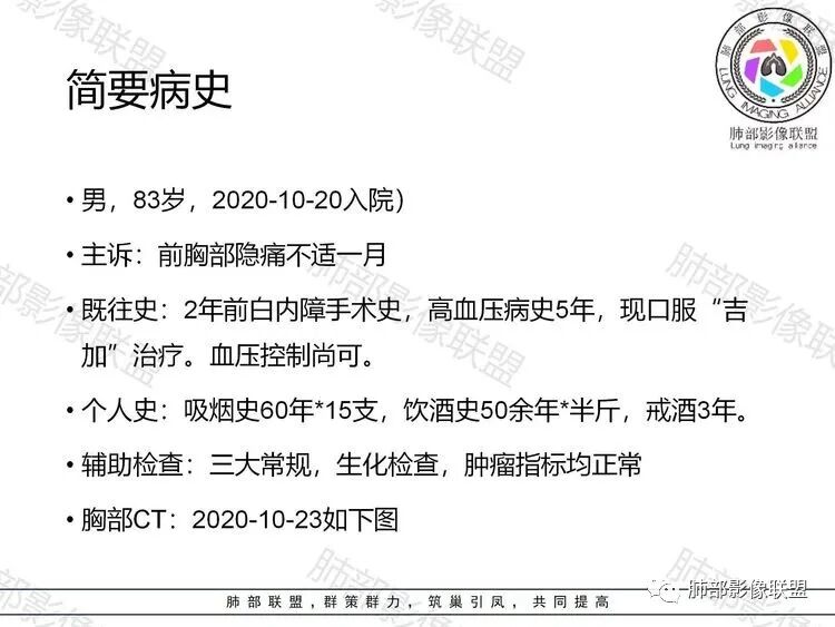 老年男性,前胸隐痛1月。2年前有白内障手术史。右下肺结节,沿中轴呈梭形,膨隆,边清、无分叶,无毛刺,近端支气管截断完全堵塞,病灶以远未见阻塞性炎症及肺不张。内部密度基本均匀,增强轻微强化,似见局部低密度影。纵隔及右肺门见肿大淋巴结。整体考虑恶性可能性大,小细胞癌?鳞癌?注意鉴别良性结节—错构瘤。