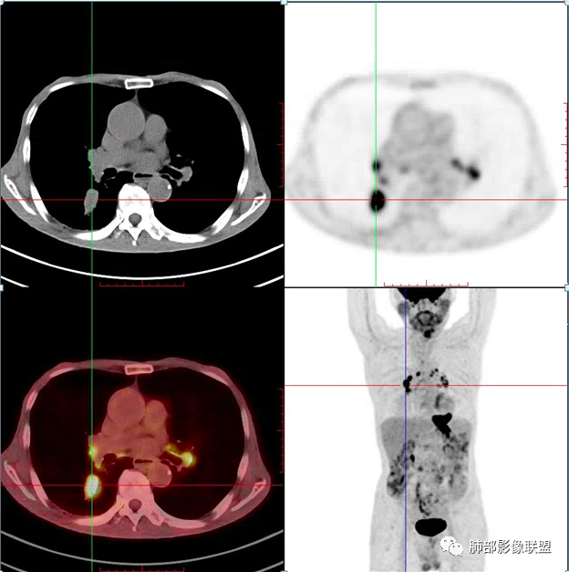 男,83,前胸部隐痛不适1月。有长年大量吸烟史。胸部CT:肺气肿,右肺下叶纺锤型实性结节灶,边界清晰,支气管截断,内部密度不均匀,增强扫描不均匀强化,右肺门淋巴结大。考虑恶性病变:小?鳞?鉴别炎性肉芽肿、错构瘤等。