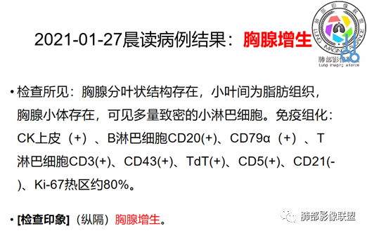 4.这同时也提出了另外一个问题:胸腺淋巴瘤患者治疗后的影像评价。请问,治疗后增大的胸腺到底是胸腺反弹性增生还是淋巴瘤残留?放射性镓核素扫描是靠谱的评价手段。从病理结果来看,是符合淋巴滤泡样增生的,与临床症状符合。