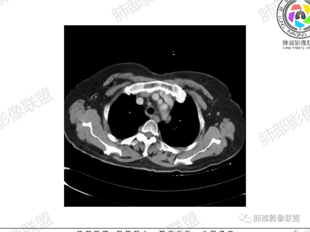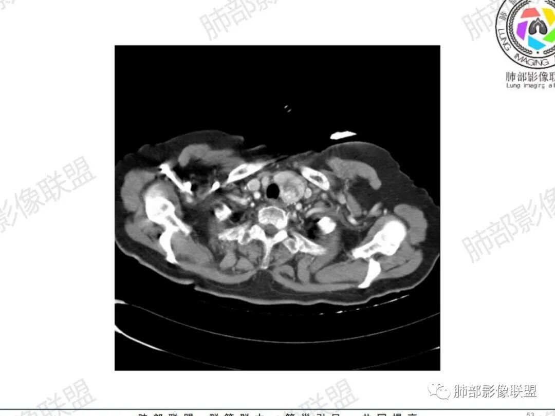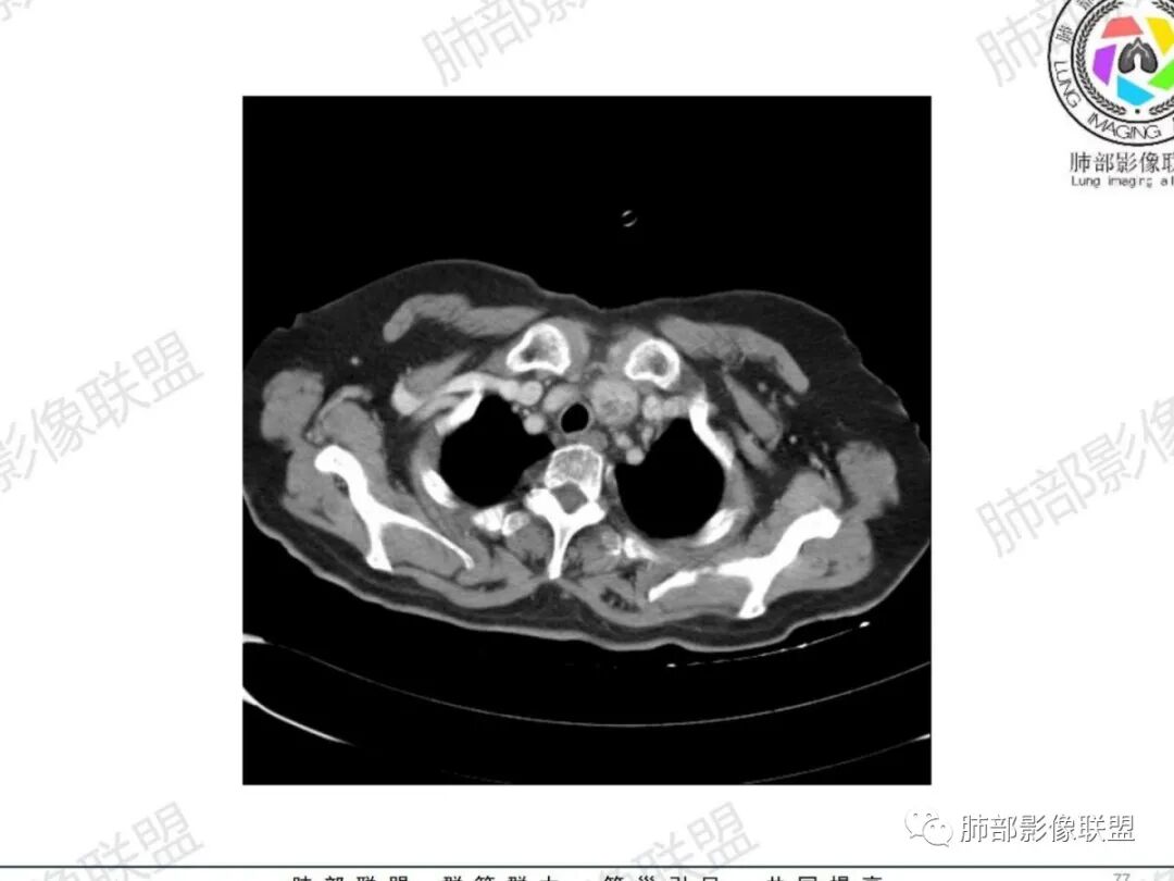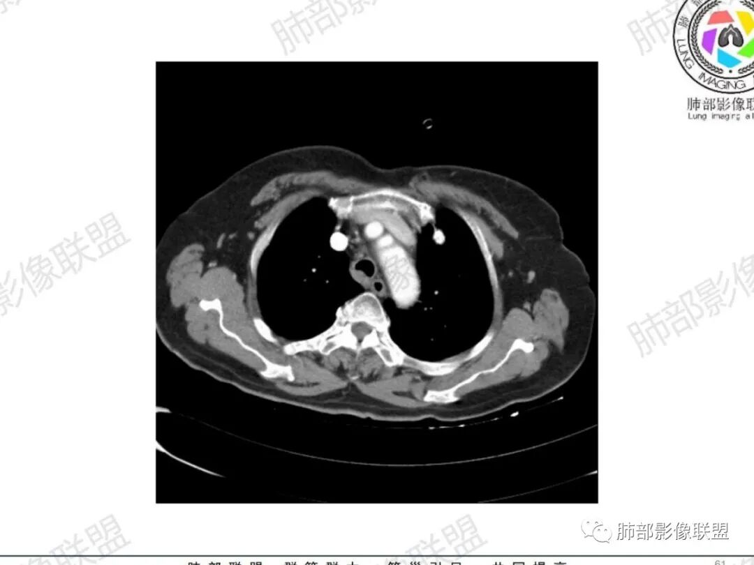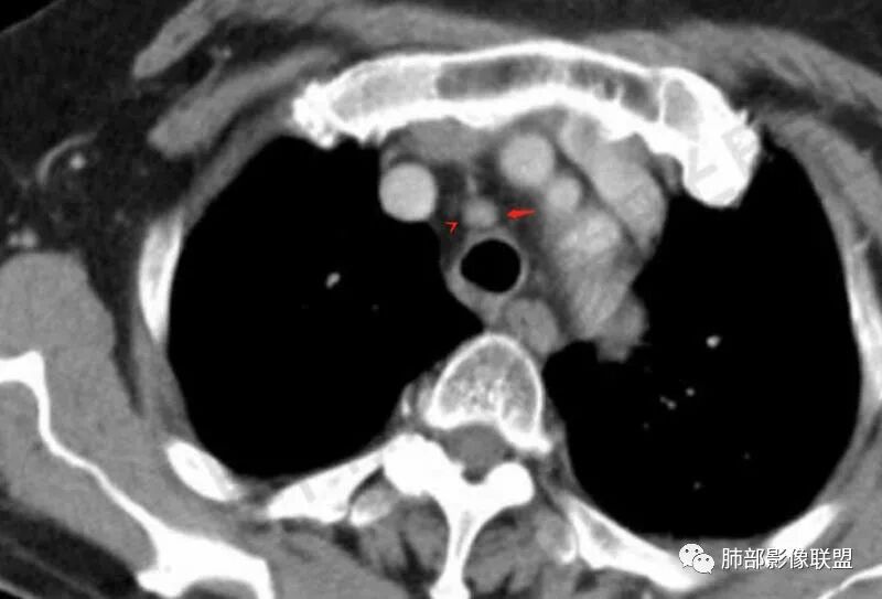 宽基底,腔内外,看似边界清楚、光滑, 但是附近气管壁增厚,还是首先要考虑恶性,附近淋巴结也不太放心,因为强化明显