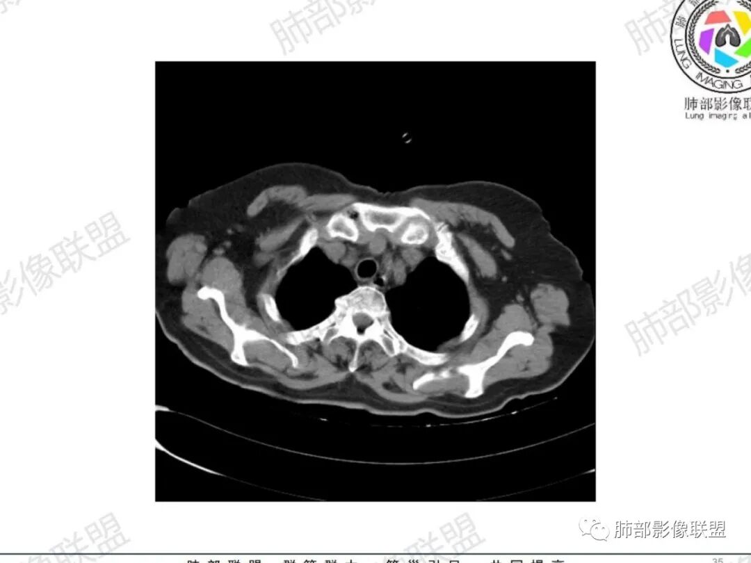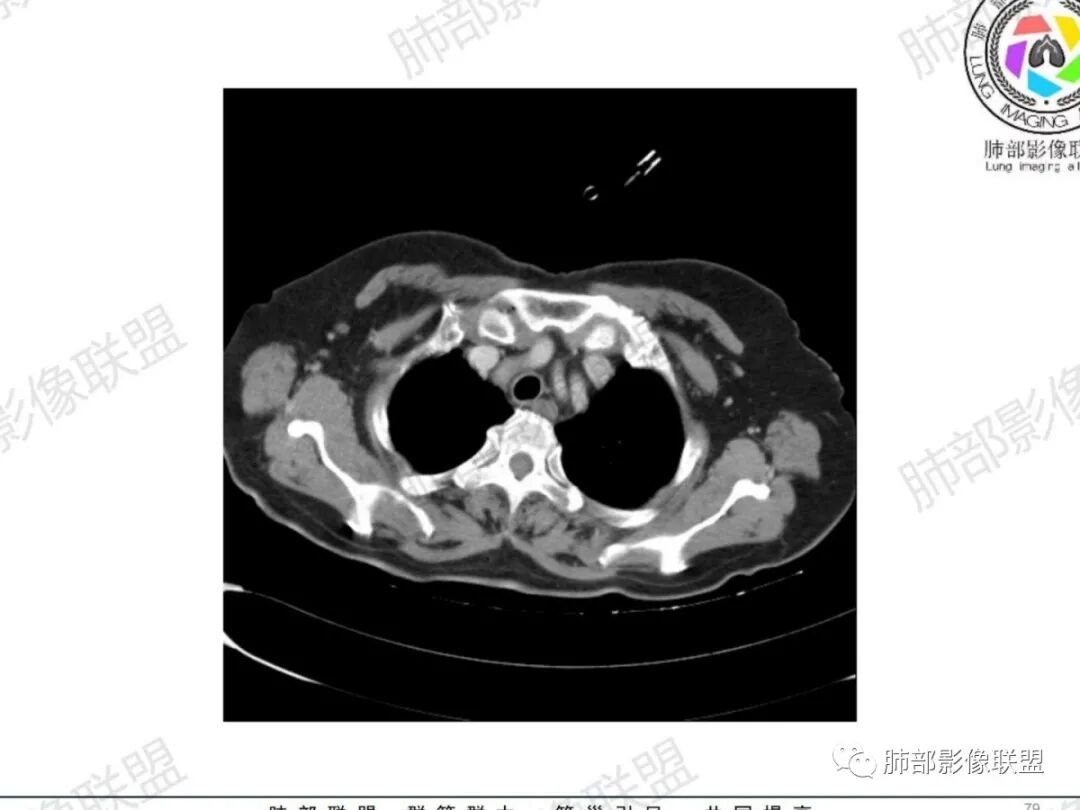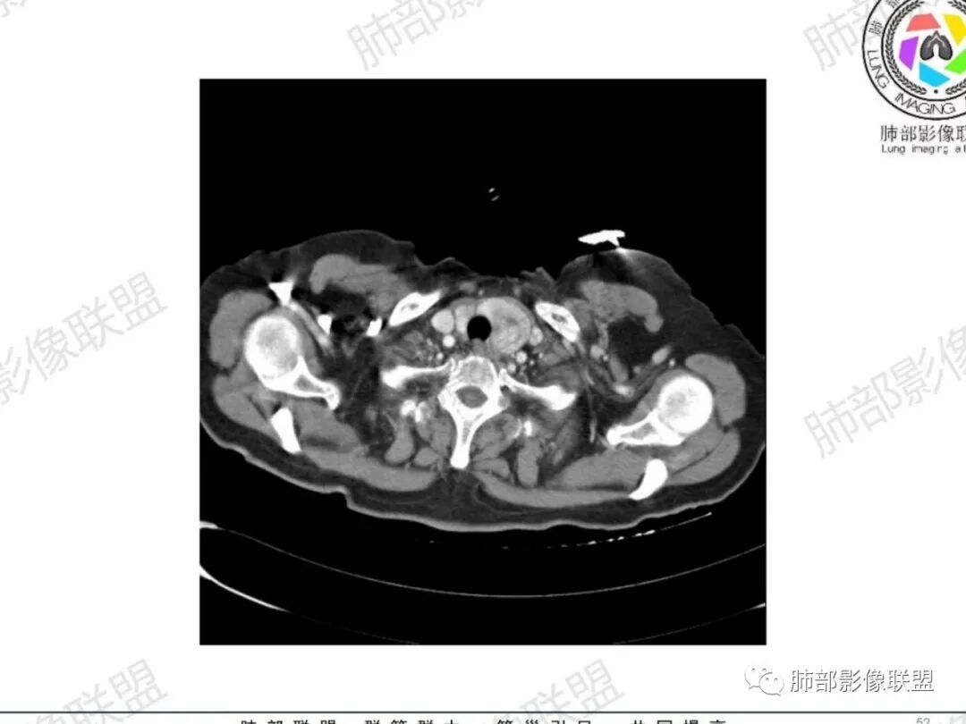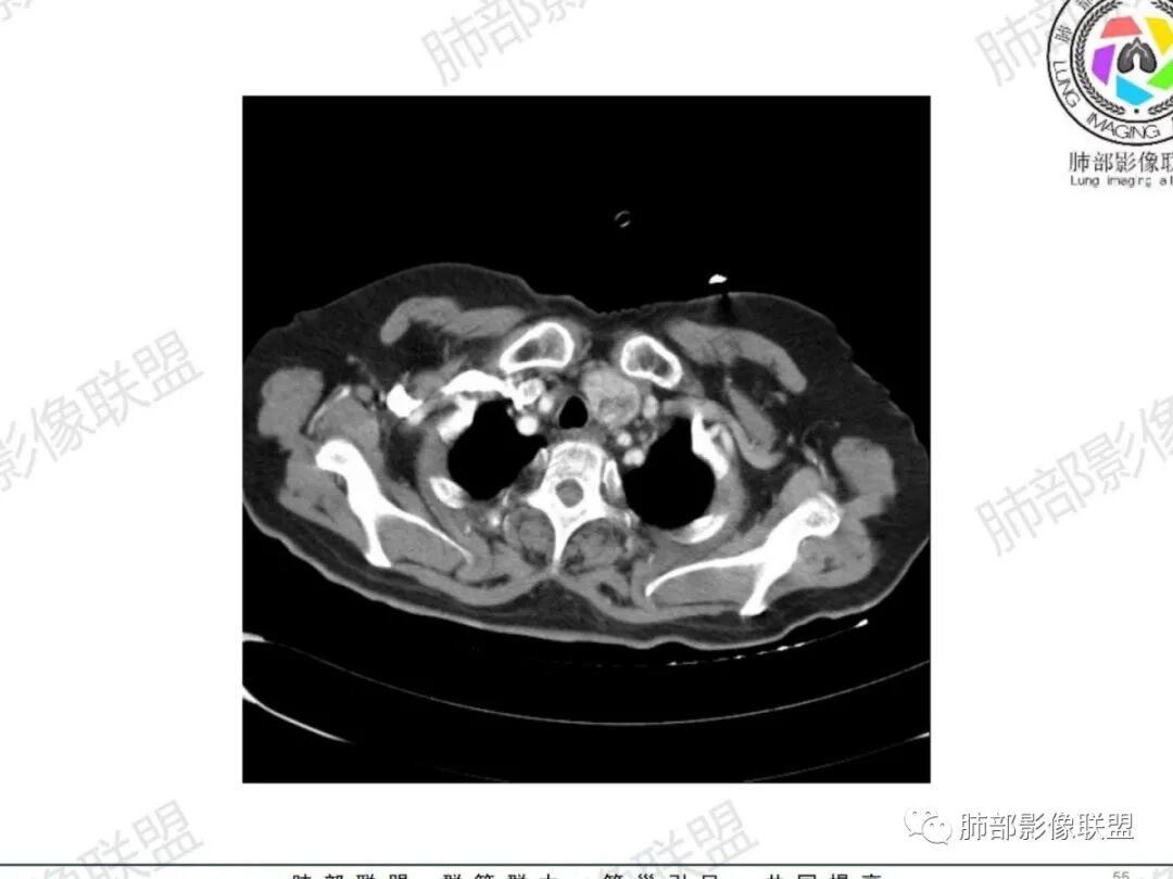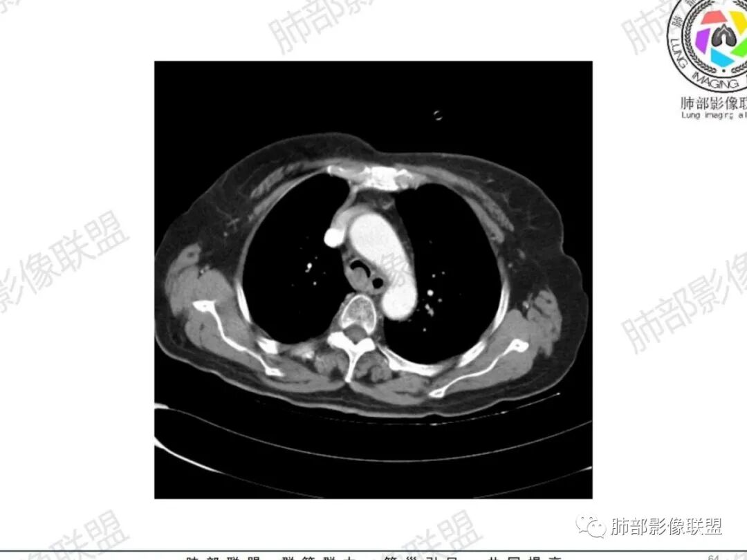 宽基底,腔内外,看似边界清楚、光滑, 但是附近气管壁增厚,还是首先要考虑恶性,附近淋巴结也不太放心,因为强化明显