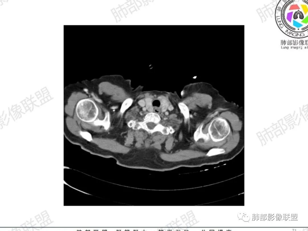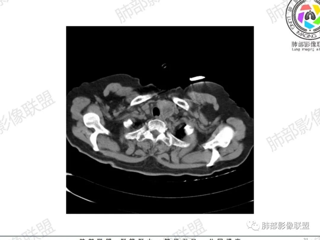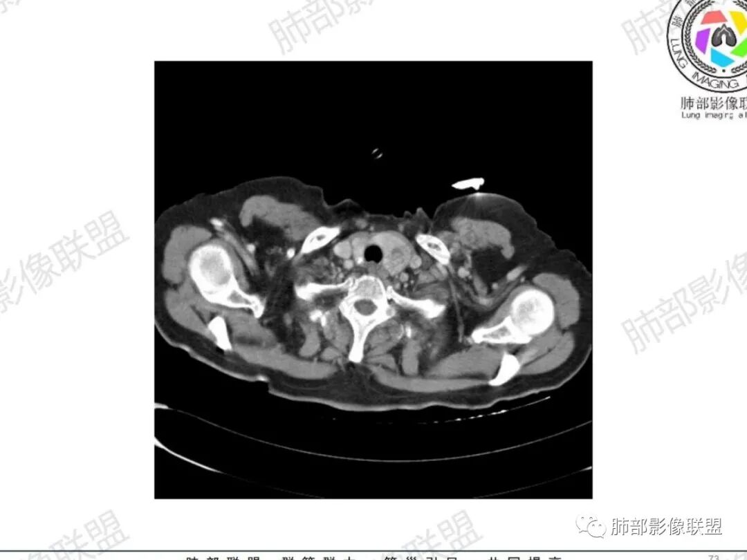 1、鳞癌:多见于男性,有吸烟史。可朝腔外生长,多为类圆形,气管或支气管偏心狭窄或环形增厚,常合并坏死,强化不等。生长在大支气管的鳞癌阻塞严重,周围会有明显阻塞性肺炎和肺不张。淋巴结转移相对较迟。