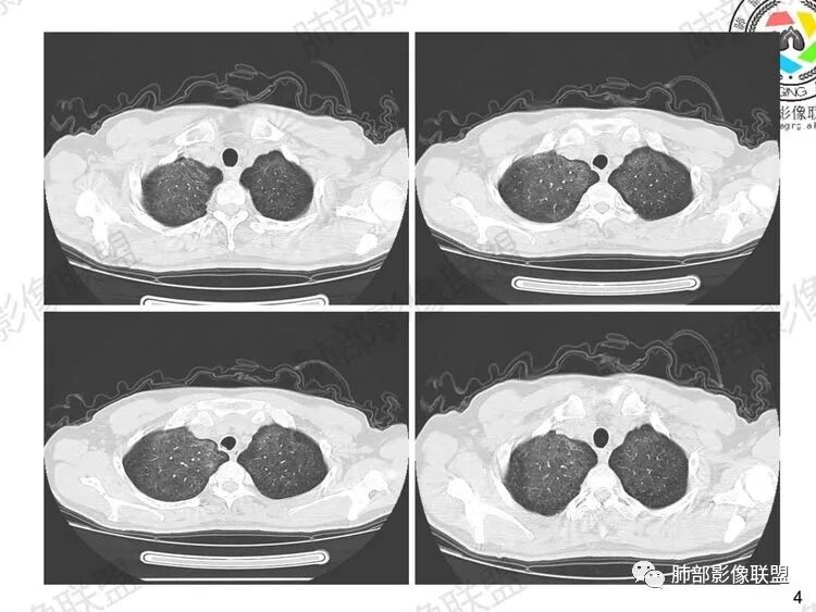 两肺叶弥散性GGo,胸膜下清,职业农民,考虑过敏性肺泡炎,与PCP鉴别。